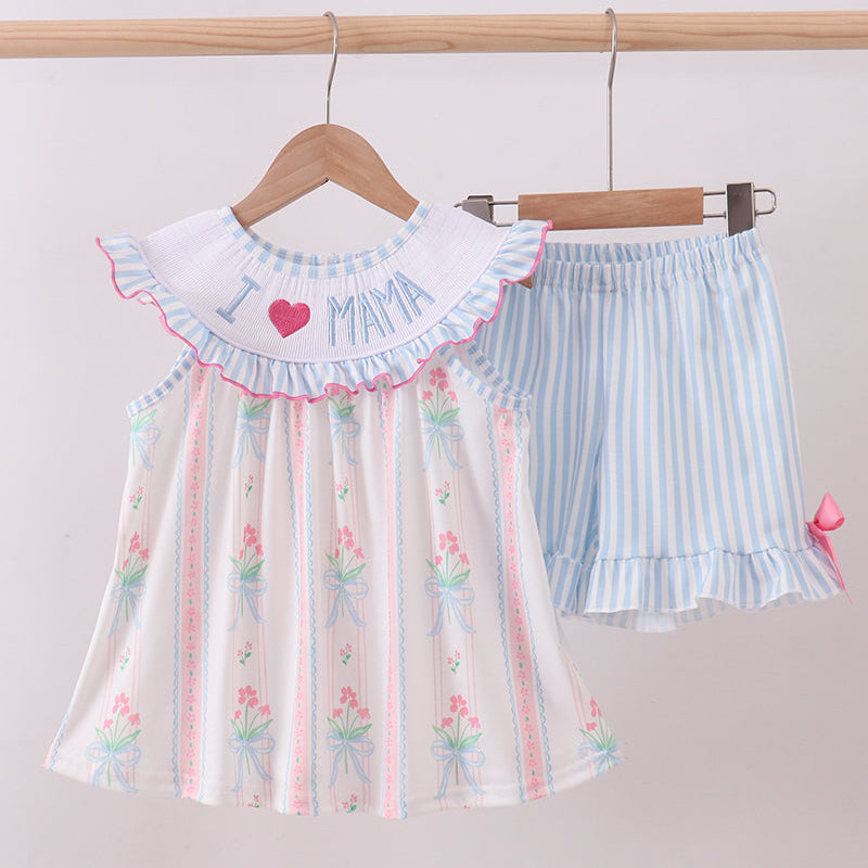 Dress her in love with the I Love Mama Floral Smocked Ruffle Shorts Set!