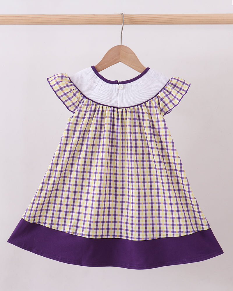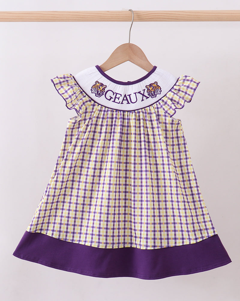 Your little Tiger will shine on game day in the LSU GEAUX Smocked Ruffle Dress! Featuring classic purple and gold plaid with a beautifully smocked neckline embroidered with “GEAUX” and tiger accents, this dress is the perfect blend of team spirit and Southern charm.