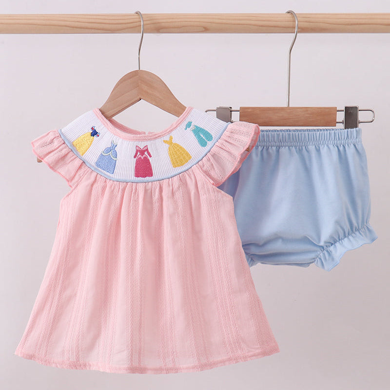 Make every day feel like a fairytale with the Princess Couture Smocked Bloomer Set. This delightful two-piece outfit features a beautifully smocked neckline embroidered with colorful princess dresses—perfect for your little royal.