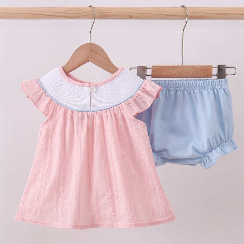 The soft pink top includes flutter ruffle sleeves and a lightweight, textured fabric that flows beautifully with every twirl. Paired with comfy blue bloomers featuring gentle elastic at the waist and legs, this set blends boutique sweetness with all-day comfort.