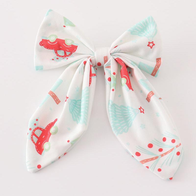 Add a touch of festive charm to your little one’s holiday look with the Tree Haulin’ Holiday Hair Bow. Featuring a playful Christmas car and tree print, this sailor-style bow is the perfect finishing touch for holiday outfits, family photos, or Christmas morning fun. Made with soft, lightweight fabric, it’s comfortable enough for all-day wear while keeping the festive spirit alive. Whether paired with cozy pajamas or a Christmas dress, this bow makes every holiday moment picture-perfect.