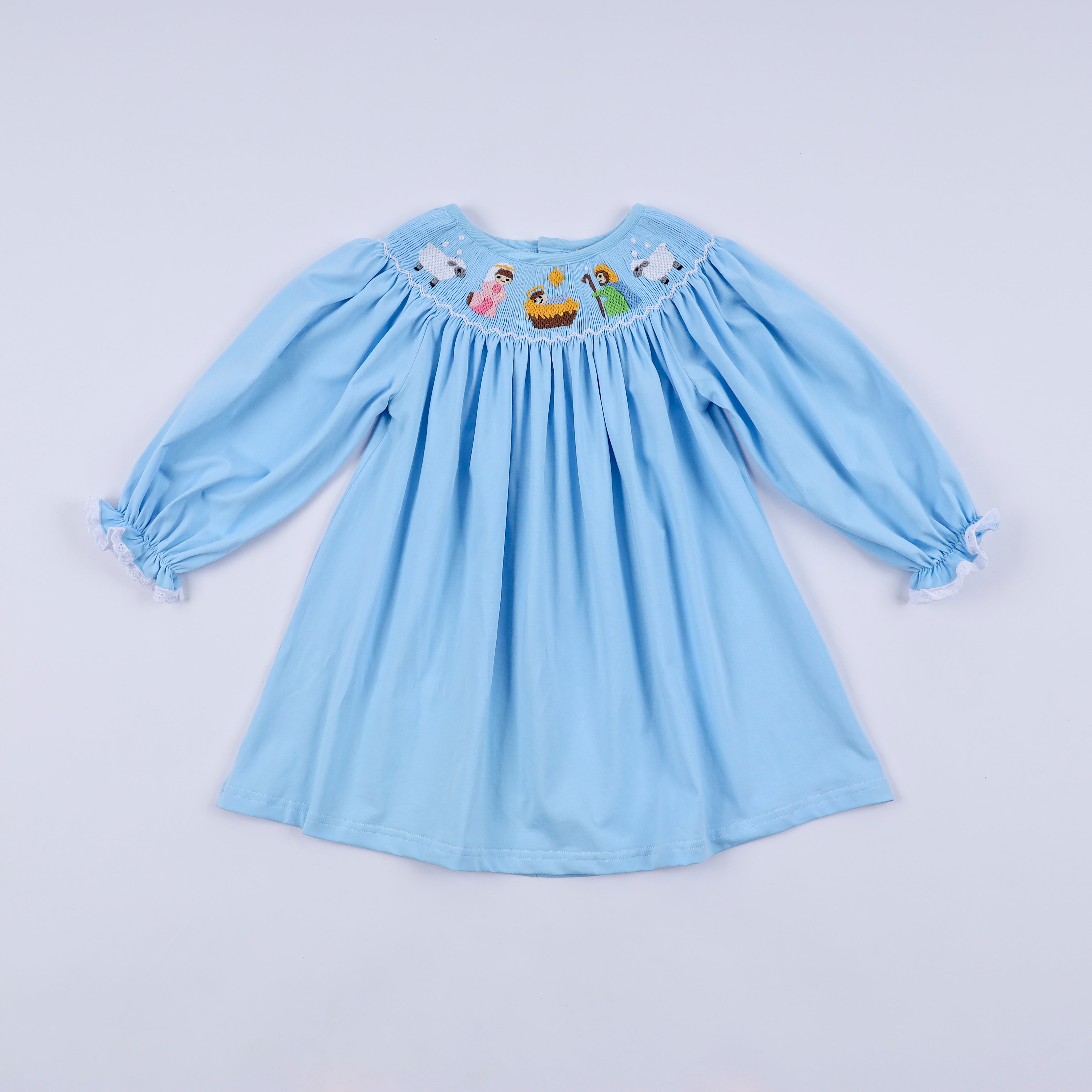 Celebrate the heart of the season with our Blessed Nativity Blue Smocked Ruffle Dress. This precious holiday dress showcases an exquisitely smocked Nativity scene featuring Baby Jesus, Mary, Joseph, and peaceful lambs—crafted in soft, timeless pastel embroidery.