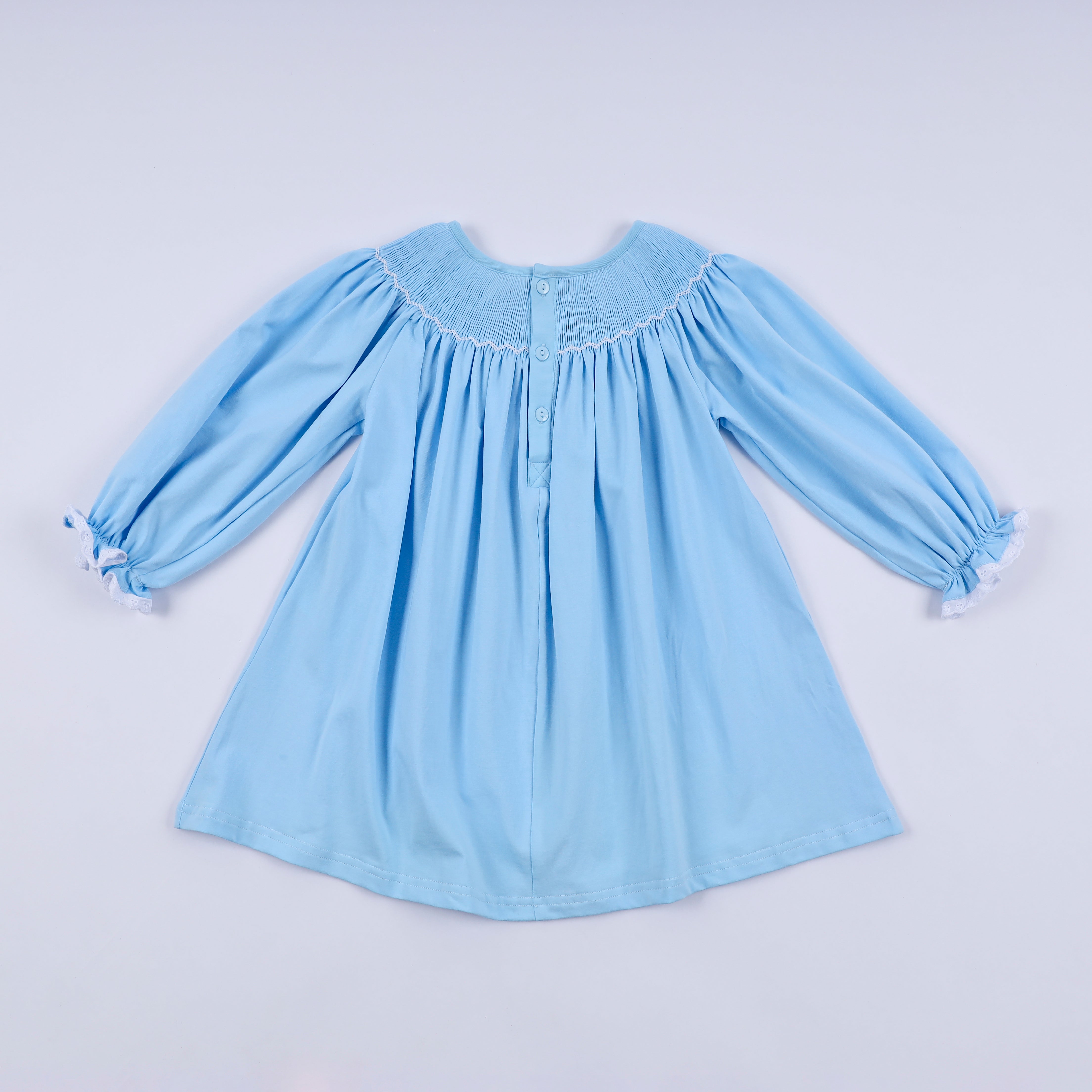 Made from a cozy, breathable blue knit, this dress offers a flowing, comfortable silhouette perfect for little ones on the move. Long sleeves with sweet ruffled, lace-trimmed cuffs add the perfect finishing touch for a classic, heirloom look.