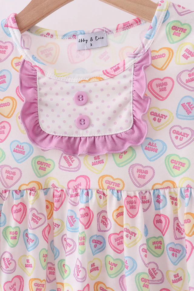 Bright, playful, and full of Valentine charm, our Conversation Hearts Purple Ruffle Pants Set is made for the little sweetheart who loves all things colorful and cute. The long-sleeve top features a pastel conversation heart print with sweet sayings, plus darling details like gingham ruffle trim, flutter sleeves, and a polka-dot placket framed in lavender ruffles.