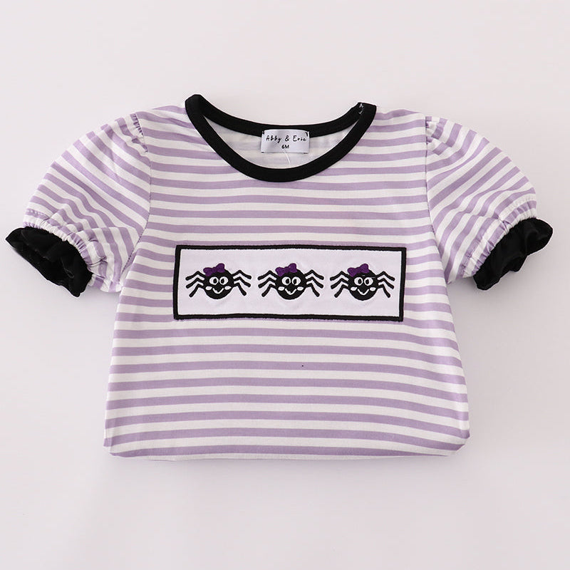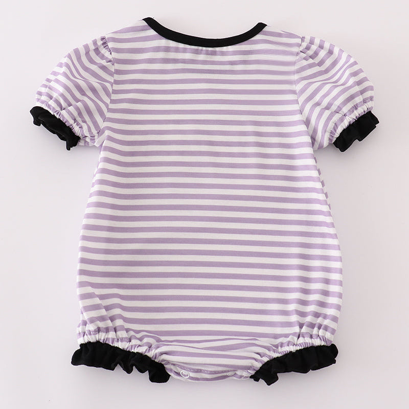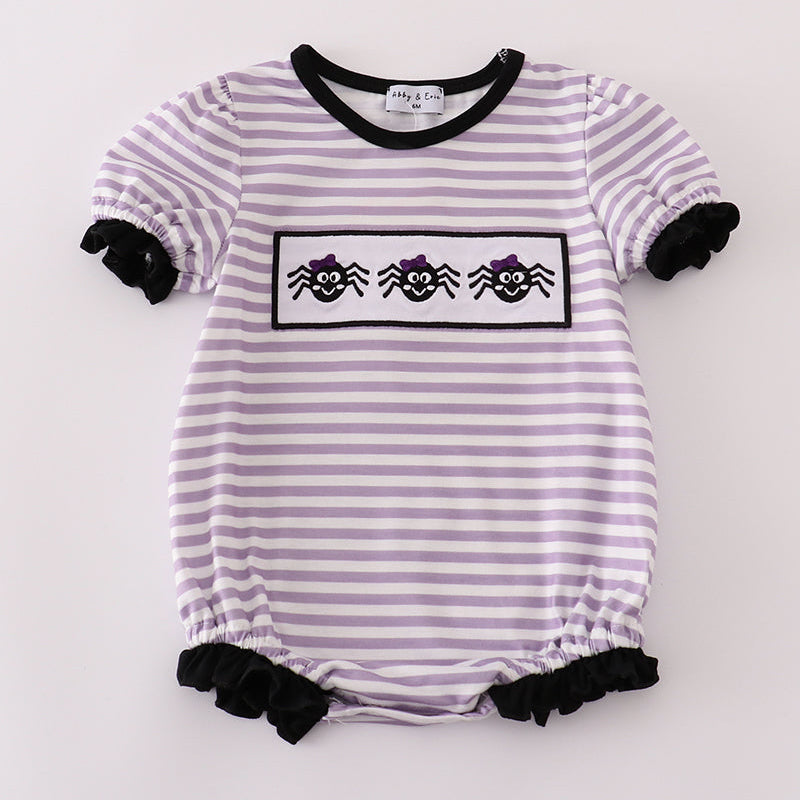 Tags: spider baby girl romper, Halloween romper for girls, embroidered stripe romper, spooky cute baby outfit, toddler Halloween clothing, lavender fall romper, Halloween baby photoshoot outfit, baby girl Halloween costume alternative