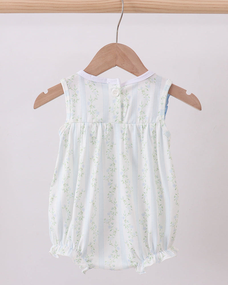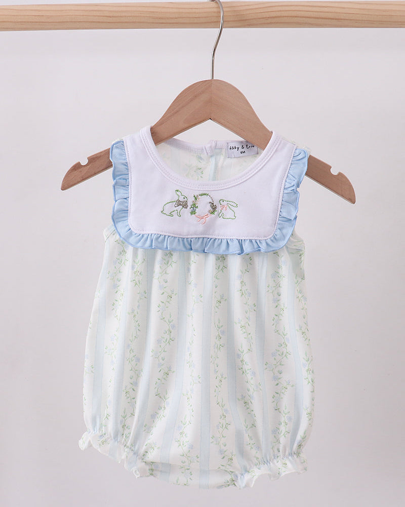 The Easter Meadow Bunny Ruffle Bubble is a timeless spring essential, designed with delicate details and classic boutique charm. This precious one-piece features a soft pastel meadow print, an embroidered bunny trio on the bib, and gentle ruffle trim in a soft blue accent for a picture-perfect Easter look.