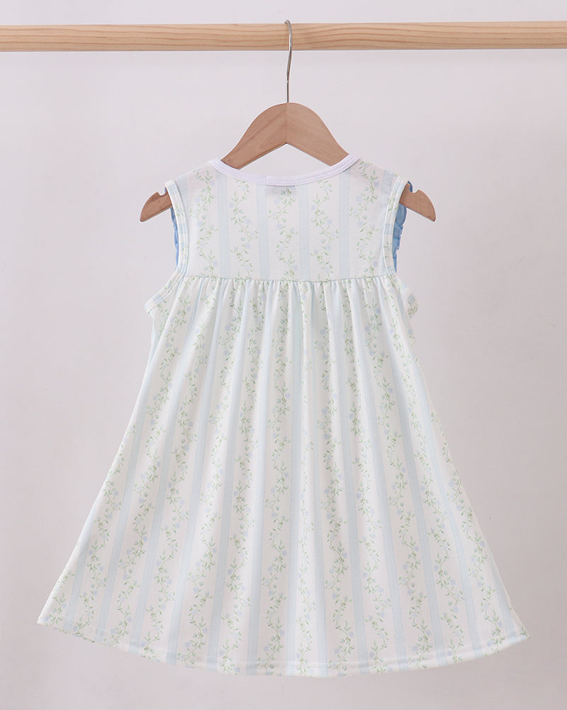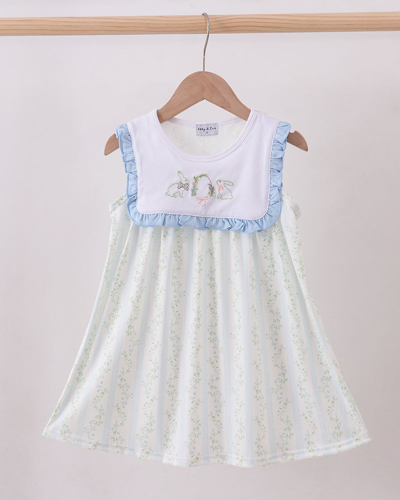 This classic dress features a soft pastel floral stripe print paired with a beautiful embroidered bunny motif on the chest. Delicate ruffle trim along the neckline adds a feminine touch, while the lightweight, breathable fabric keeps little ones comfortable throughout the day.