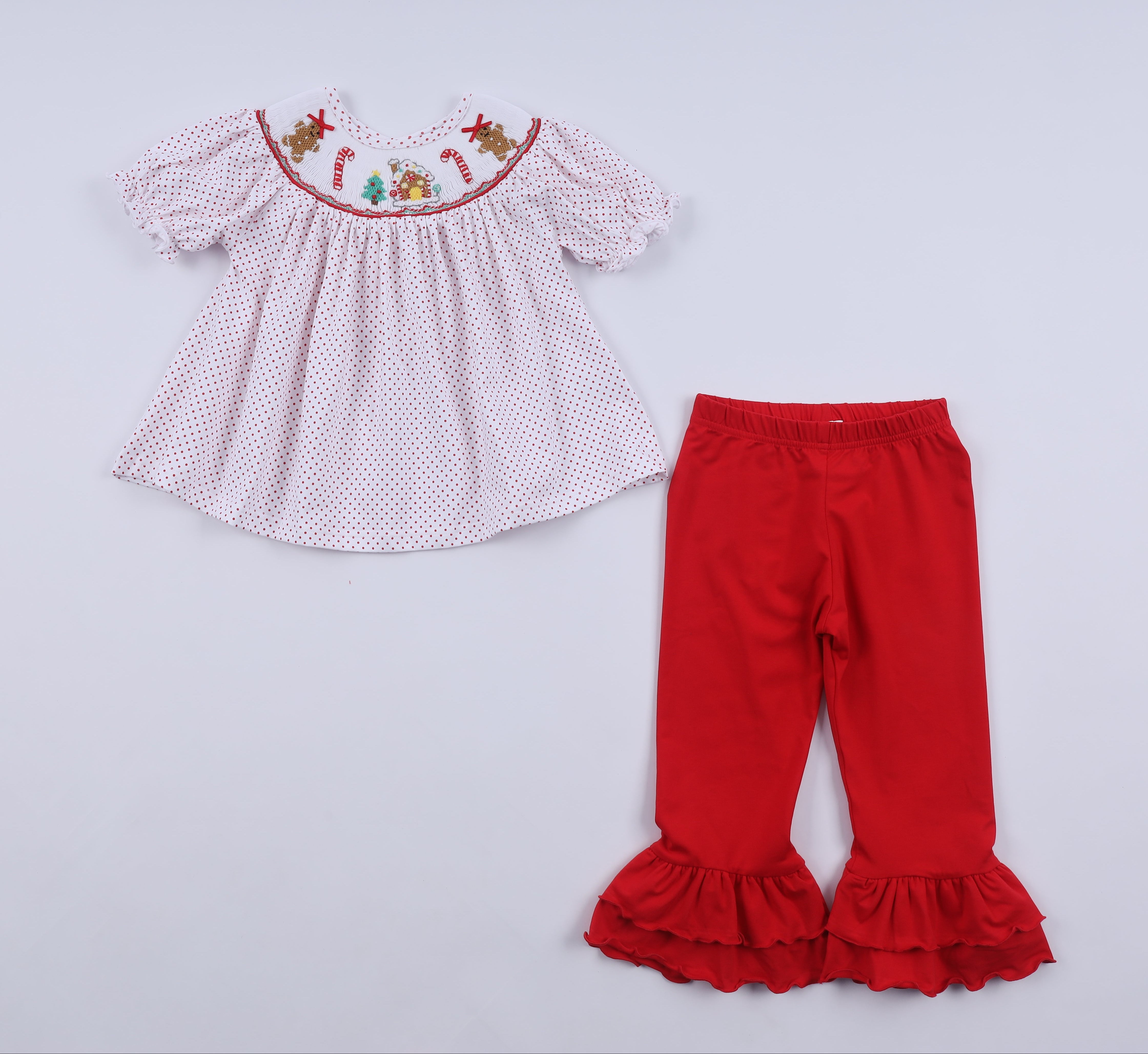 Bring sweet holiday charm to your little one’s wardrobe with our Festive Gingerbread Smocked Girls’ Ruffle Pant Outfit. The white polka-dot smocked top features delightful gingerbread characters, candy canes, and festive detailing across the neckline. Paired with bright red ruffle pants, this outfit creates a cheerful and picture-perfect Christmas look.