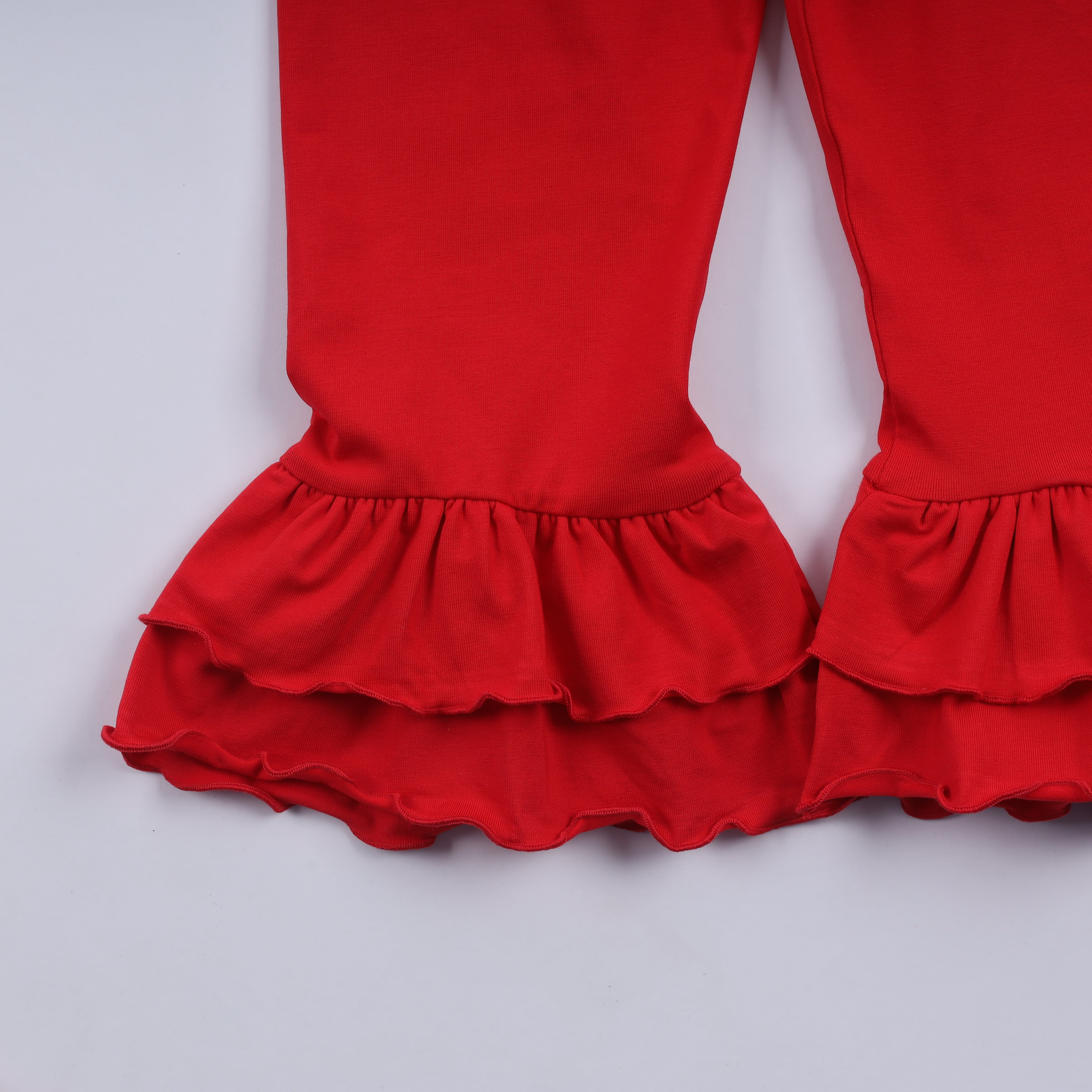 - Bright red ruffle pants for a festive flair