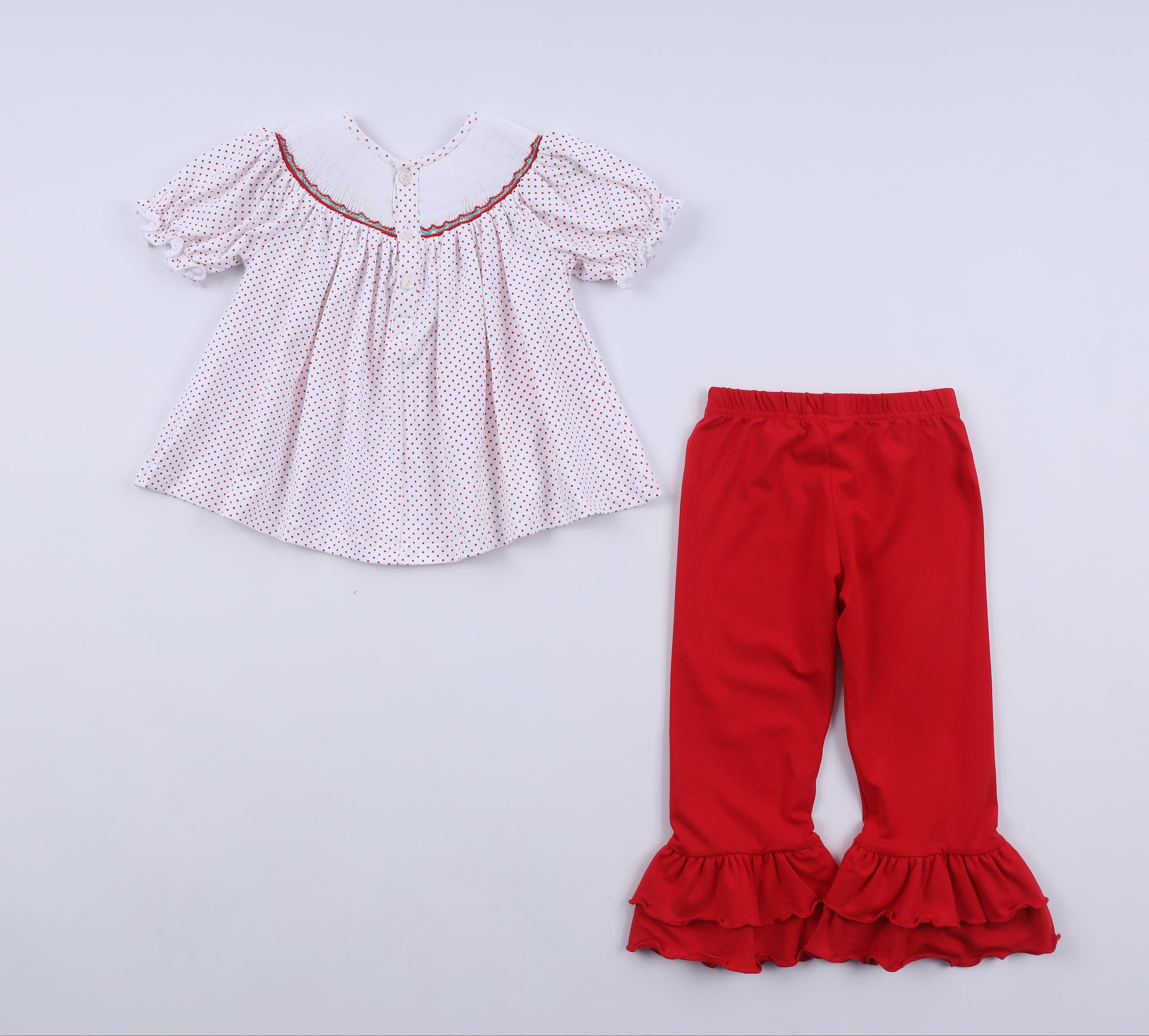 Soft, breathable fabric ensures comfort for all-day celebrating—whether for parties, school events, Santa visits, or family photos. The playful smocking and layered ruffle pant legs add just the right amount of holiday fun.