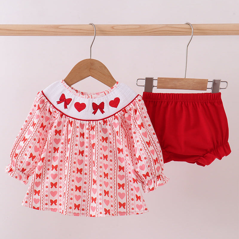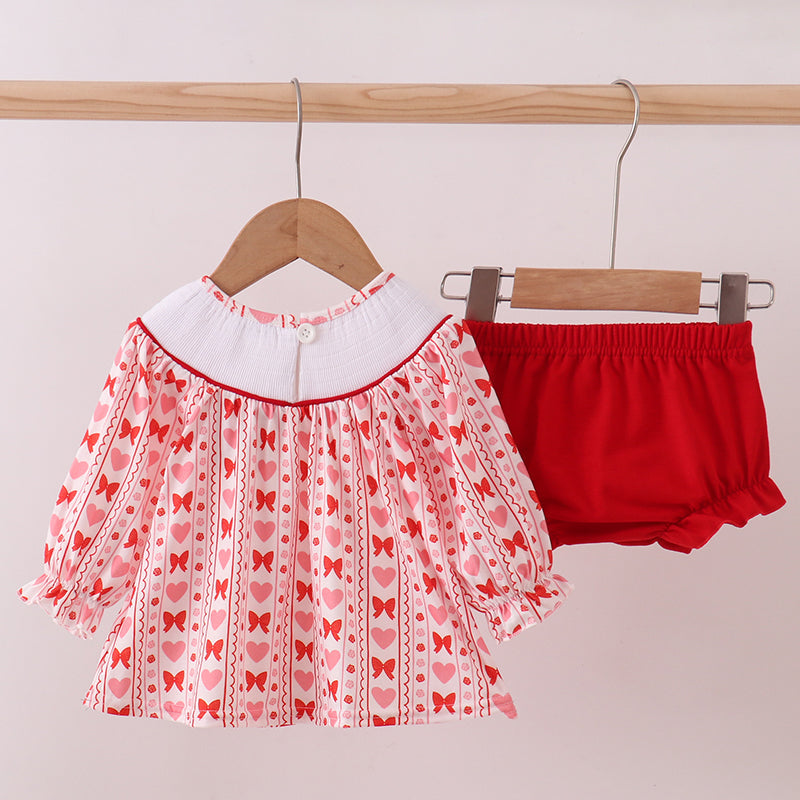 The pink printed top showcases rows of tiny hearts and bows in soft shades of red and blush, paired with coordinating red ruffle bloomers for a picture-perfect finish. With gently gathered sleeves and a breezy, comfortable fit, this set keeps baby happy while looking absolutely darling.