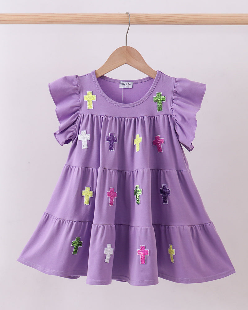 The Joyful Cross Sequin Purple Twirl Dress is a stunning faith-inspired piece designed to shine on Easter Sunday and beyond. Crafted in a rich lavender-purple hue, this dress features sparkling sequin cross appliqués arranged across a tiered twirl skirt for a joyful, meaningful touch.