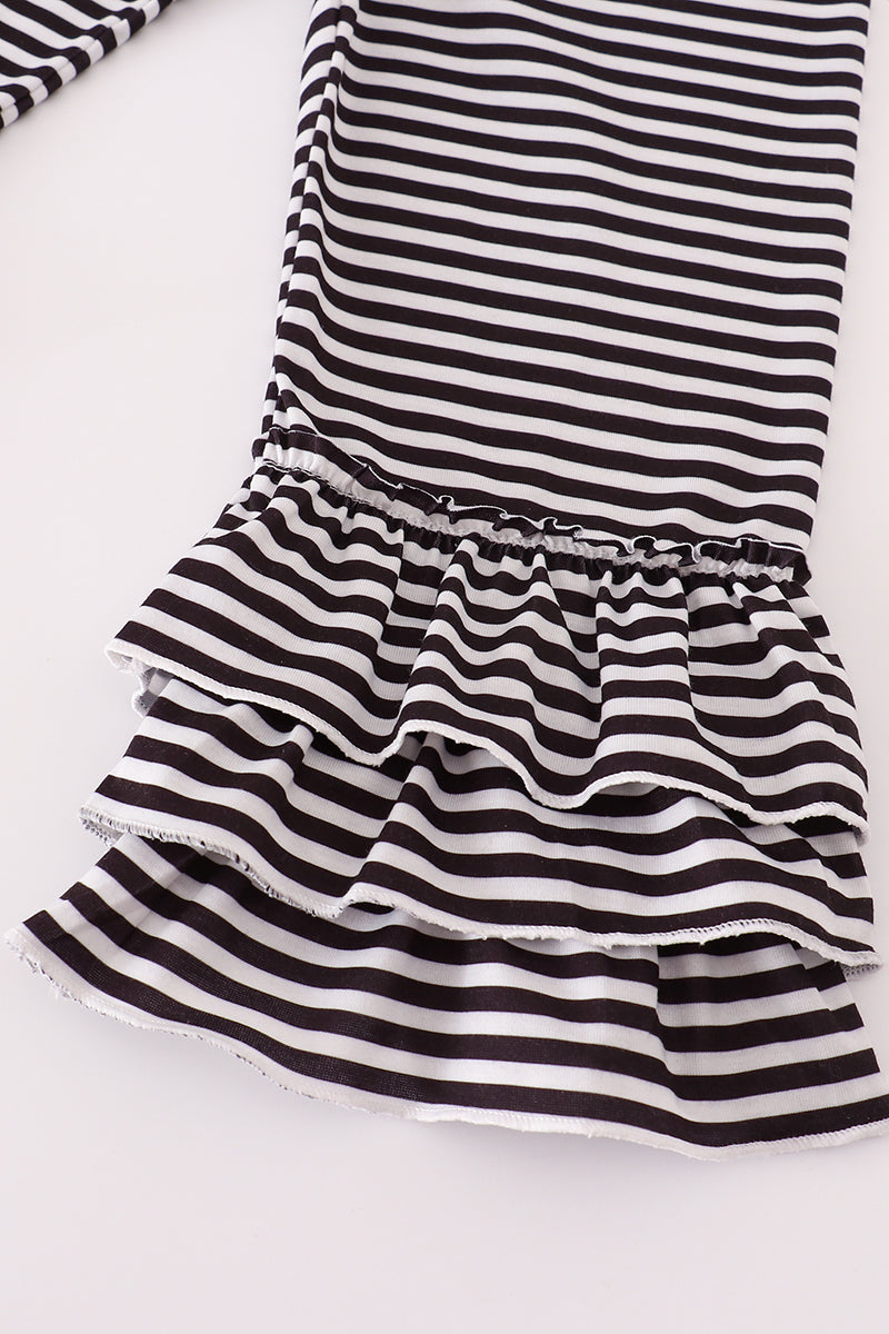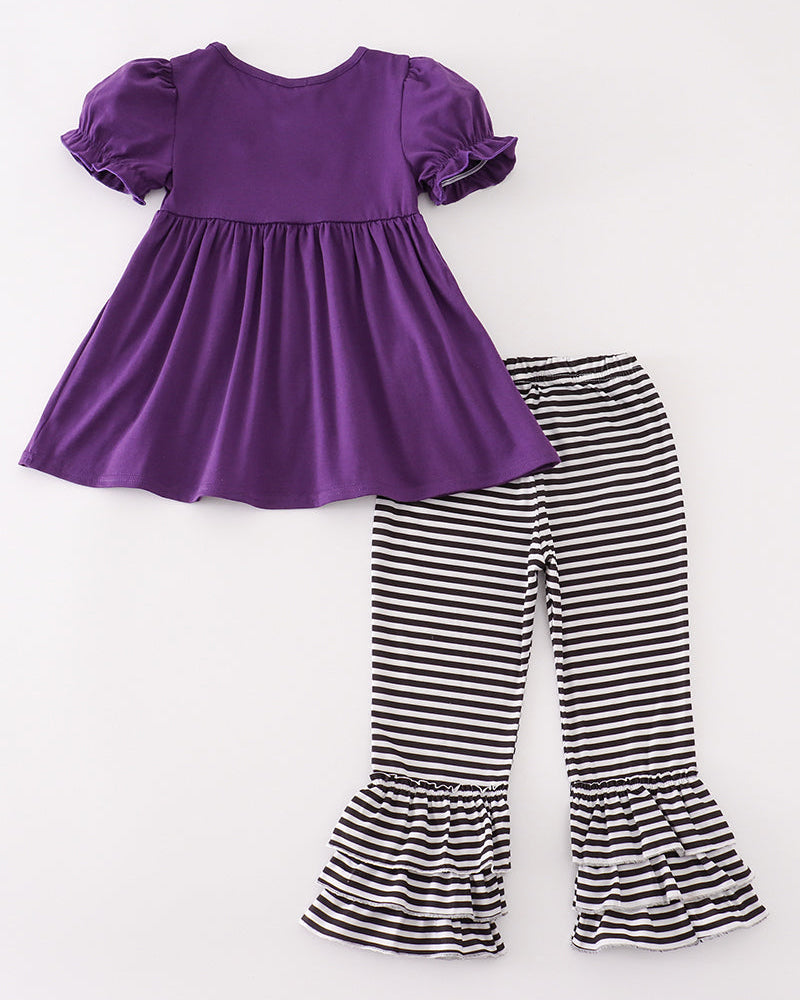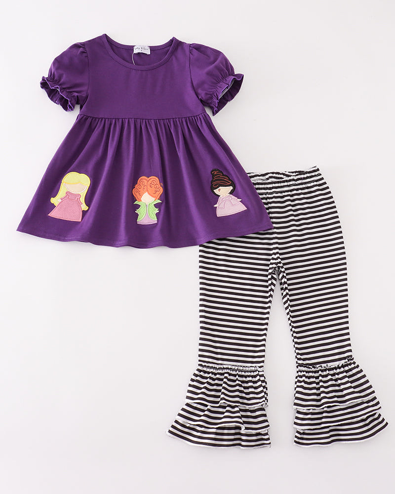 Add a spell of cuteness to her wardrobe with the Little Witches Applique Purple Pants Set. This adorable outfit features a vibrant purple top with charming witch appliques and playful puff sleeves, paired with black and white striped ruffle pants for a whimsical touch. Perfect for Halloween festivities, themed parties, or magical everyday adventures!