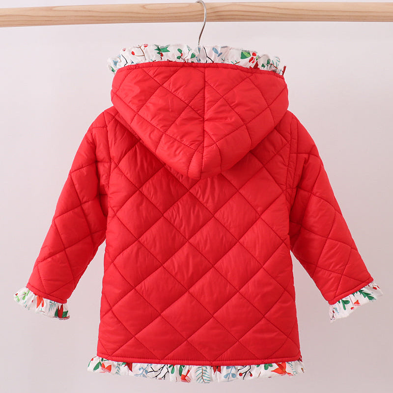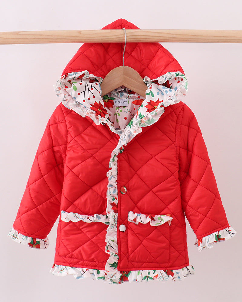 Keep her warm in festive style with our Merry Blooms Red Ruffle Quilted Jacket. This adorable holiday jacket features a bright red quilted exterior trimmed with a charming floral Christmas print lining. Sweet ruffle accents along the hood, cuffs, hem, and pockets add the perfect boutique touch.