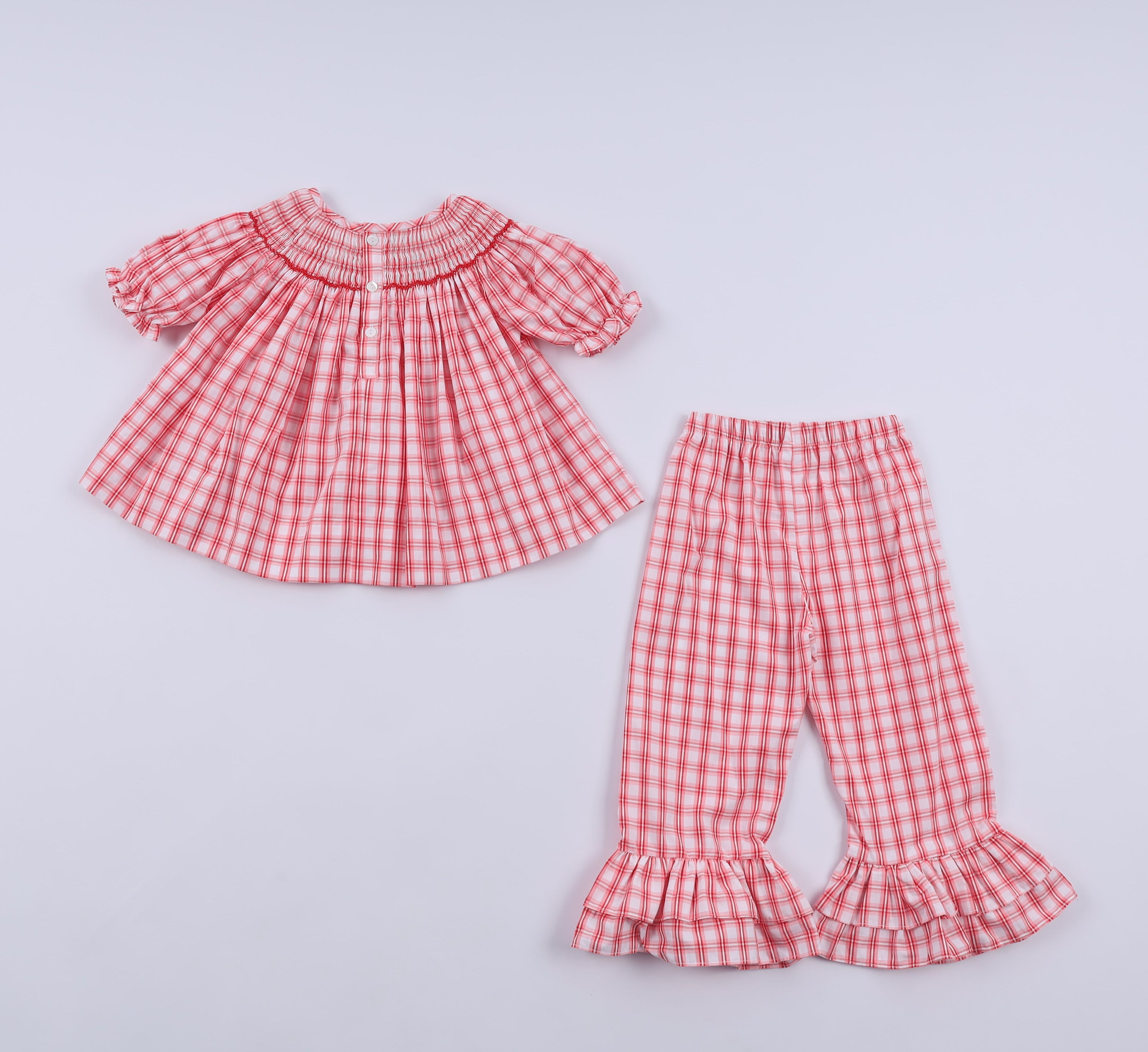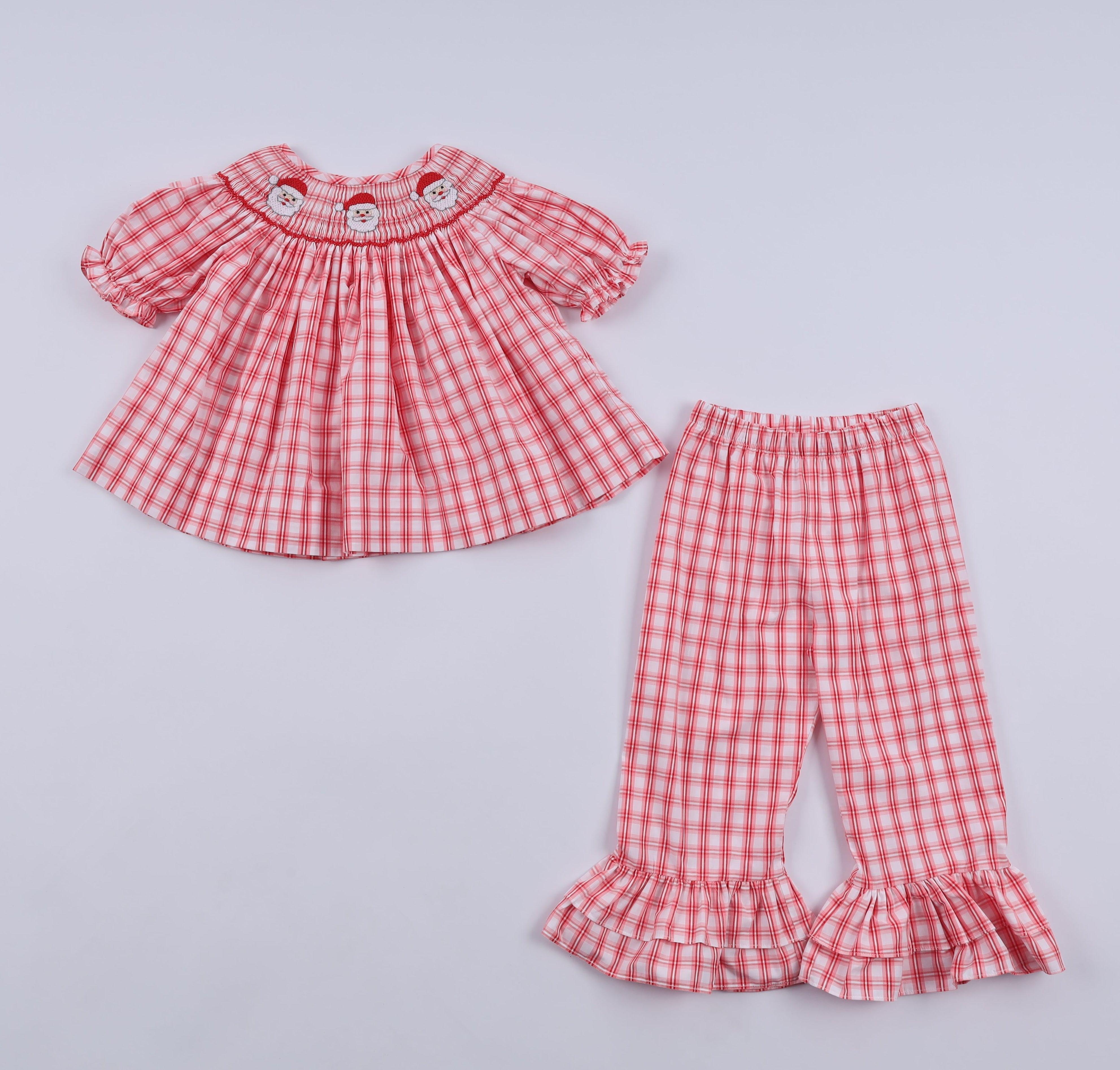 Celebrate the magic of the season with our Merry Santa Smocked Red Plaid Ruffle Pants Set. This charming two-piece outfit features a beautifully hand-smocked Santa trio across a classic red plaid bishop-style top. Paired with matching plaid ruffle pants, this set brings together timeless Christmas charm and comfortable everyday wear.