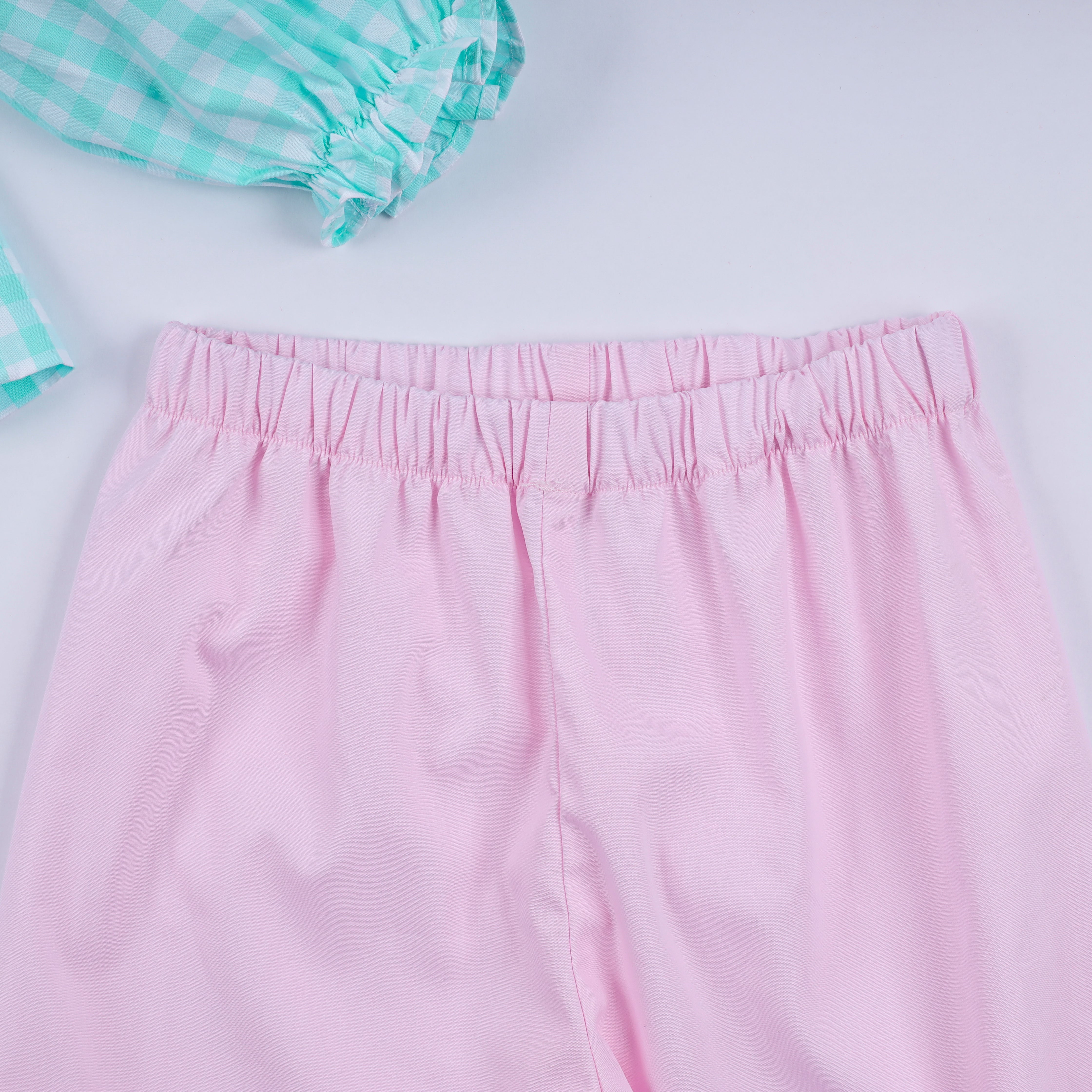 - Mint gingham long-sleeve top with pink ruffle trim