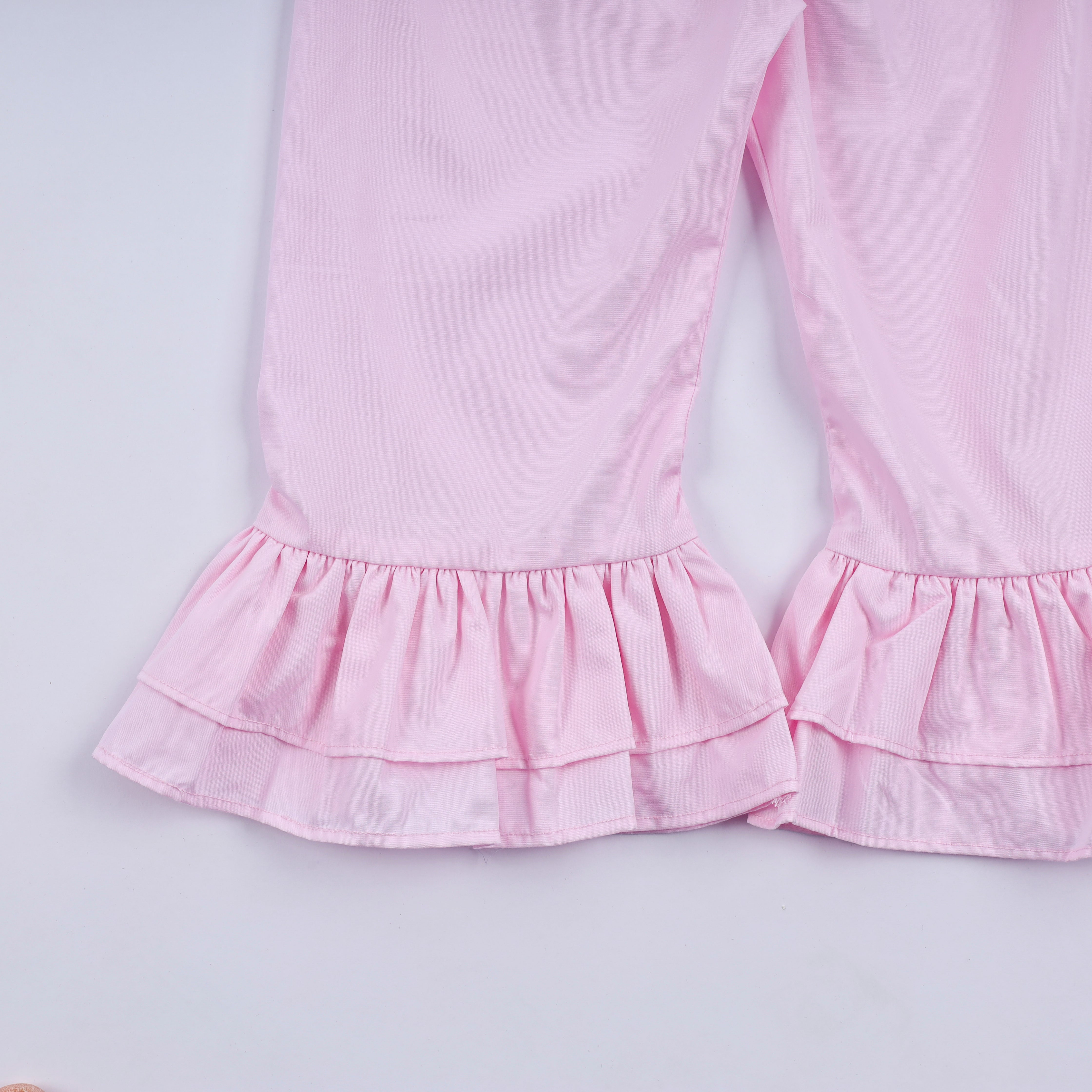 - Soft pink ruffle pants with elastic waist