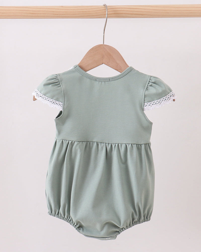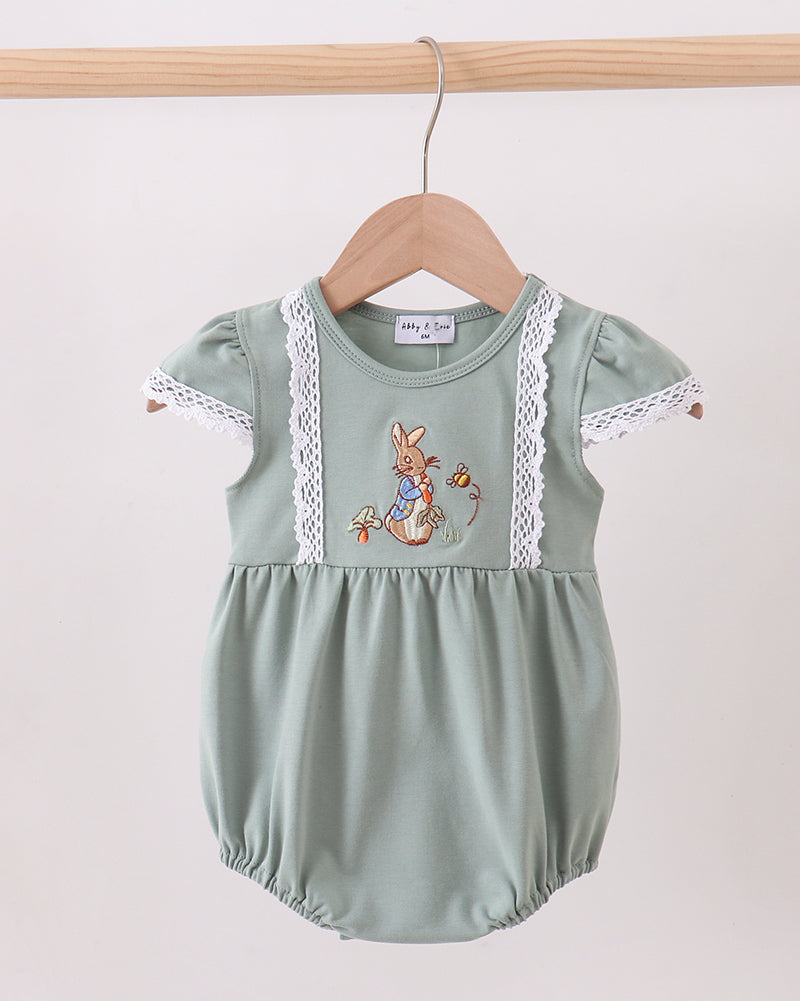 The Peter Bunny Sage Girl Bubble is a timeless and charming piece made for your little one’s sweetest moments. Designed in a soft sage green hue, this baby bubble features an adorable vintage-style bunny embroidery accented with delicate lace trim for a classic, heirloom-inspired look.