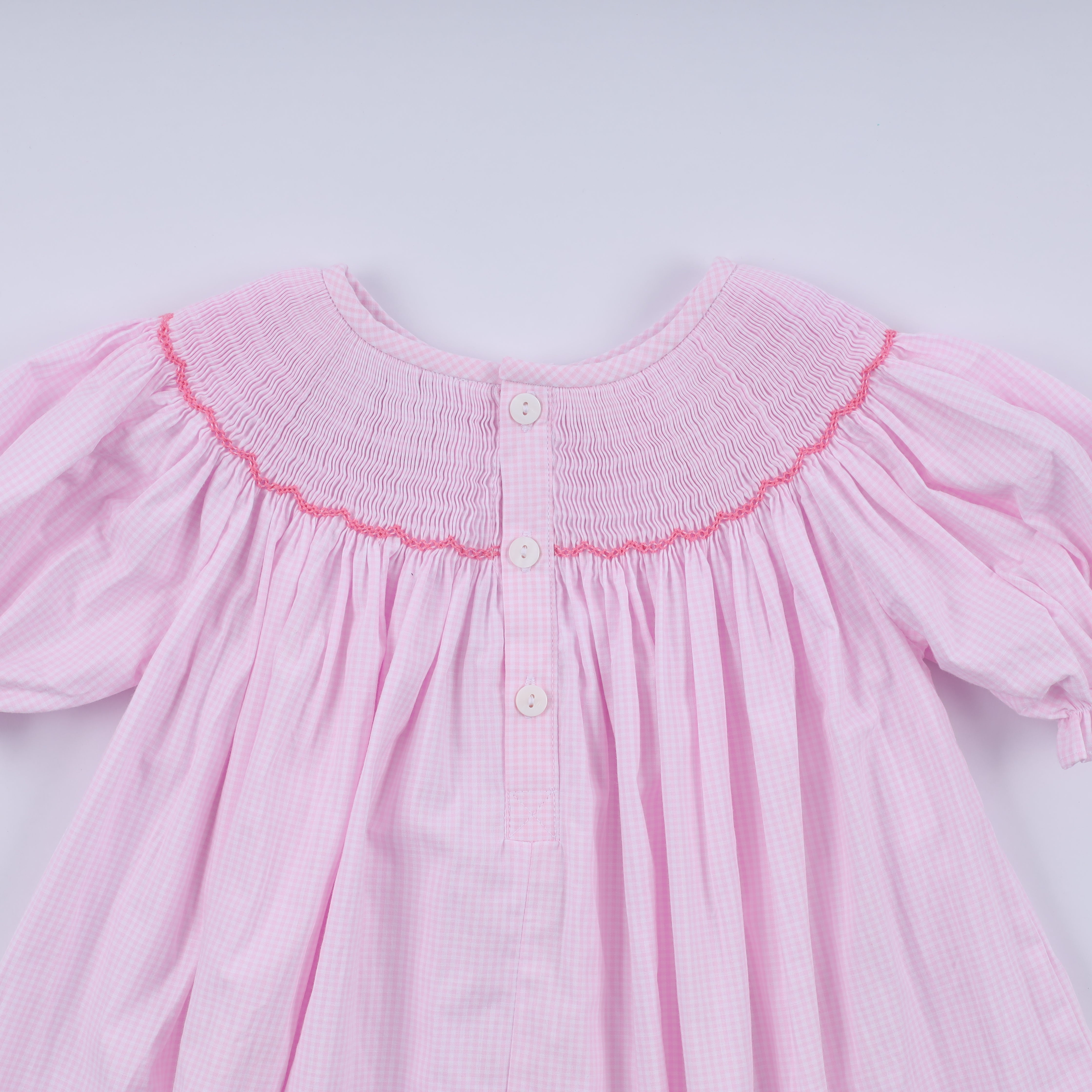 Crafted in a soft pink gingham fabric, this dress is as comfortable as it is adorable. The gently puffed sleeves, classic bishop silhouette, and timeless smocking make it a keepsake piece she’ll cherish year after year.