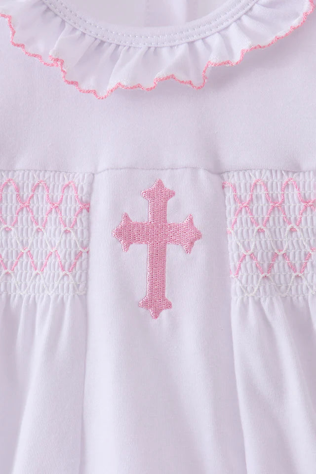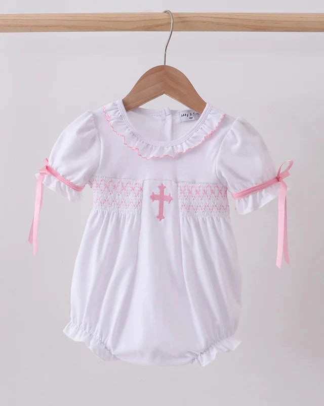 The Precious Promise Cross Smocked Girl Bubble is a timeless and elegant piece designed for special occasions. Featuring delicate smocking across the bodice and a soft pink embroidered cross, this bubble captures classic charm and faith-inspired style.