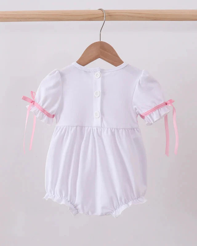 The puff sleeves with pink ribbon accents and the softly gathered bubble silhouette add sweet details that make this outfit perfect for memorable celebrations. Made from lightweight, breathable fabric, it keeps little ones comfortable throughout the day.