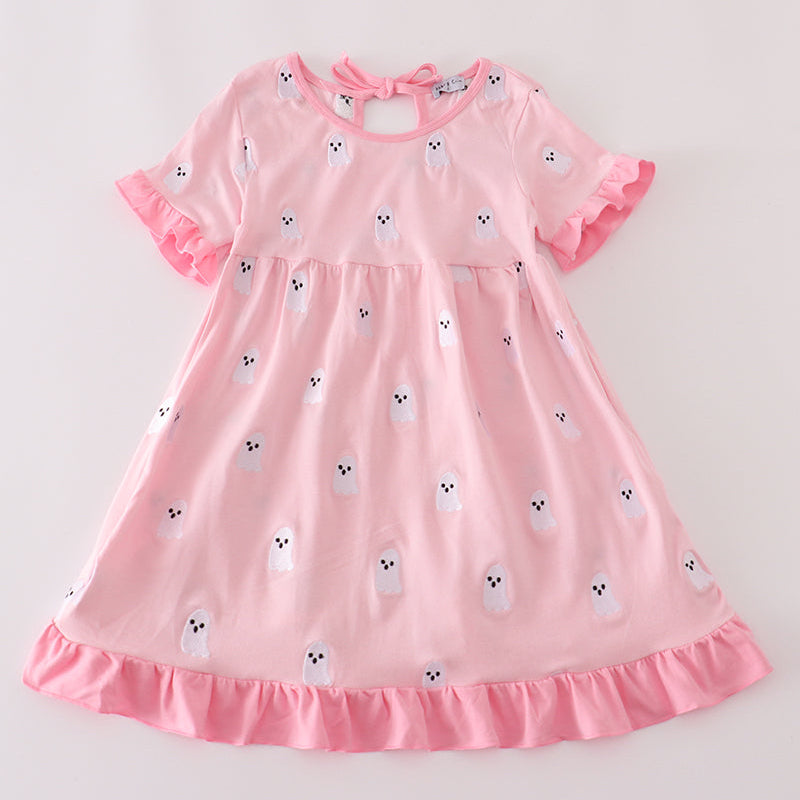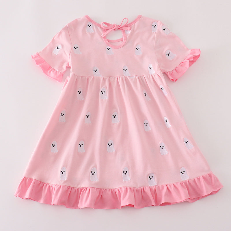 The Pretty in Pink Ghost Embroidered Ruffle Dress brings together spooky charm and sweet style in one delightful outfit. Made from soft, breathable fabric, this pastel pink dress features all-over embroidered white ghosts with expressive black eyes for a playful Halloween-inspired look that’s wearable any time of year.
