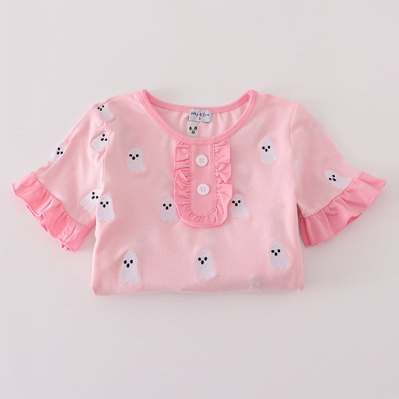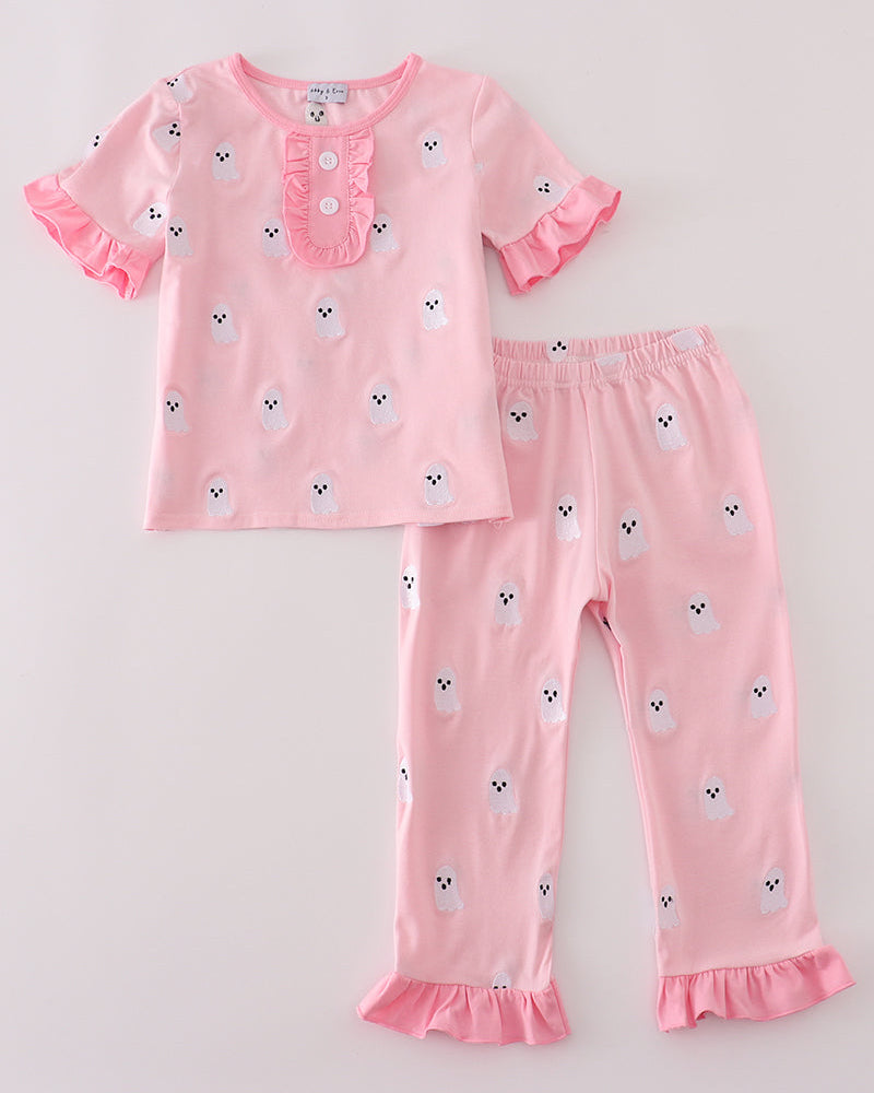 Spooky meets sweet with our Pretty in Pink Ghost Embroidered Ruffle Pajamas Set — the perfect way to celebrate Halloween in cozy, adorable style. This two-piece pajama set features a soft pink top and matching pants adorned with delicate white ghost embroidery. The ruffle-trimmed sleeves, button placket, and pant cuffs add a girly, boutique-inspired touch that’s both playful and picture-perfect.