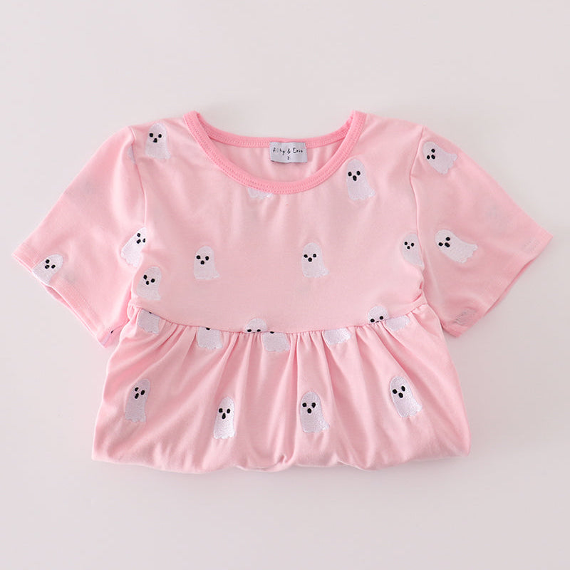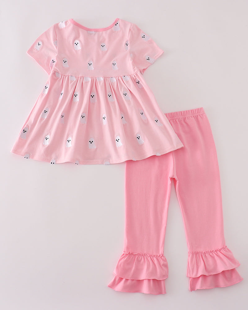 Add a touch of spooky sweetness to your little one’s wardrobe with our Pretty in Pink Ghost Embroidered Ruffle Pants Set! This adorable two-piece outfit features a soft pink tunic top adorned with charming embroidered ghost motifs that bring playful Halloween vibes to life. The matching pink ruffle pants add a twirl-worthy flair with their double-layered ruffle hem, making it perfect for festive fun, playdates, or cozy fall days.