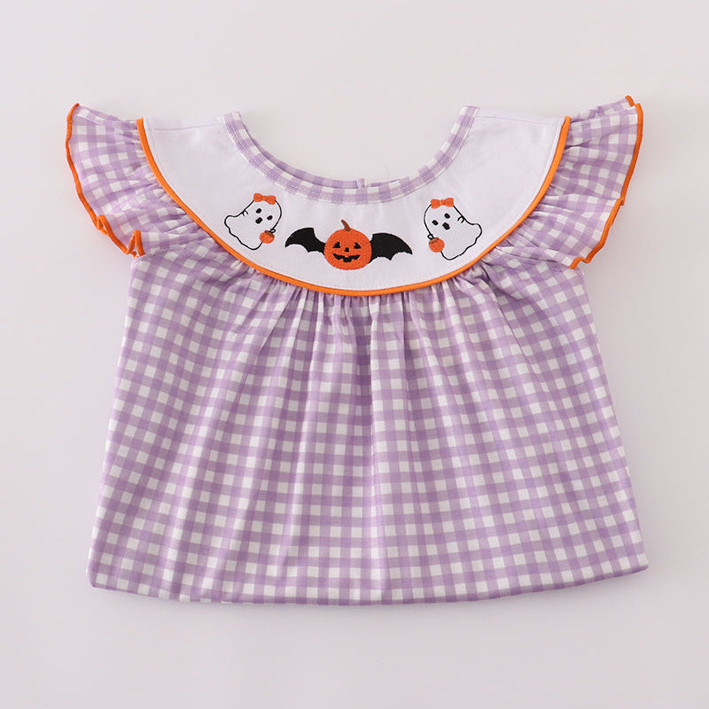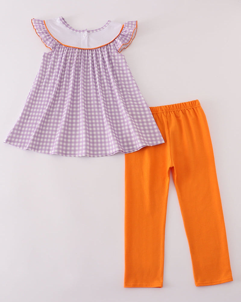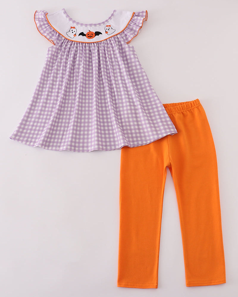 Dress your little girl in festive charm with this Pumpkin Ghost Embroidered Purple Gingham Halloween Pants Set. Featuring a sweet purple gingham flutter-sleeve top with adorable pumpkin and ghost embroidery, paired with bright orange stretch leggings, this outfit is perfect for pumpkin patch visits, Halloween parties, and fall festivities.