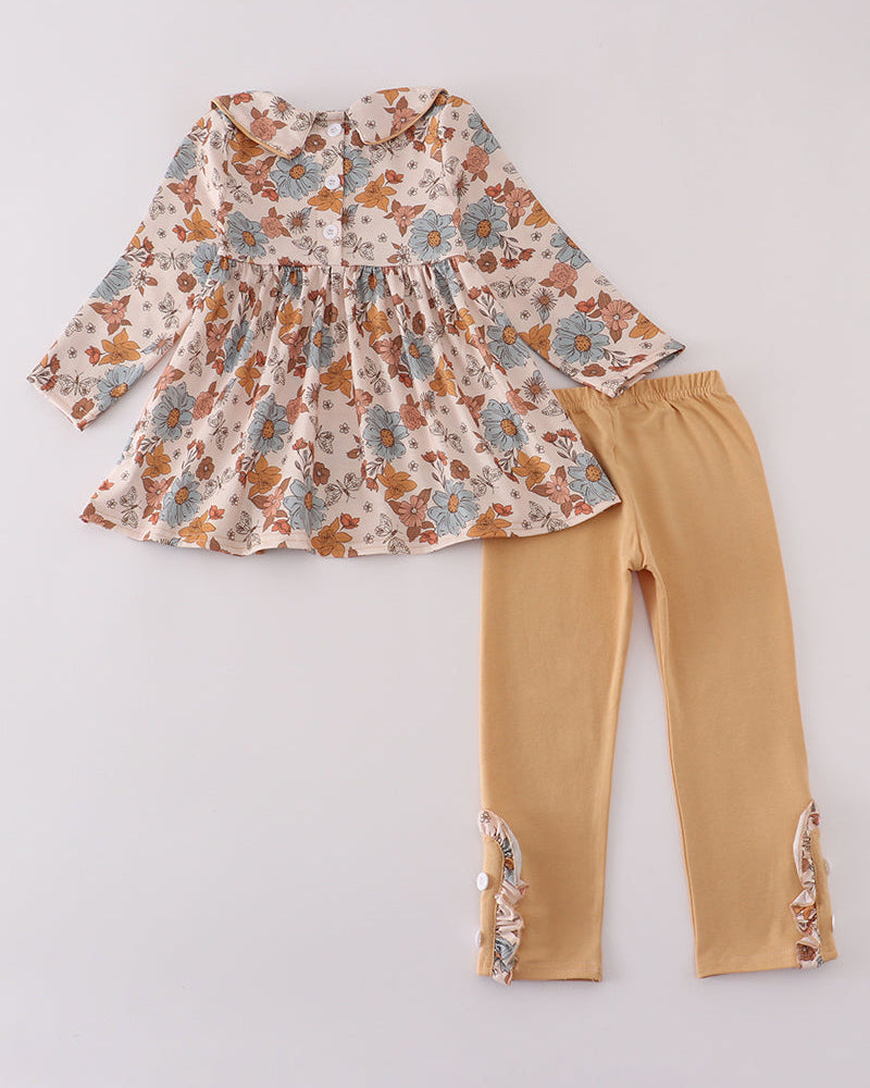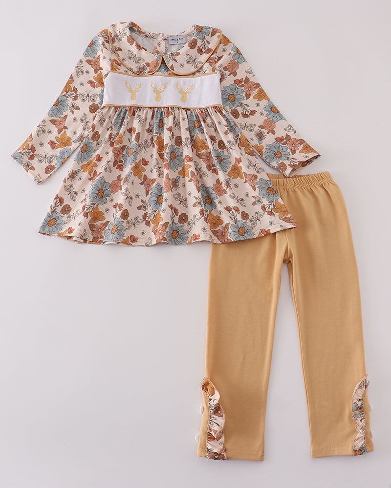 Khaki Deer Embroidered Floral Girl Pants Set – Adorable Fall Outfit for Baby & Toddler Girls