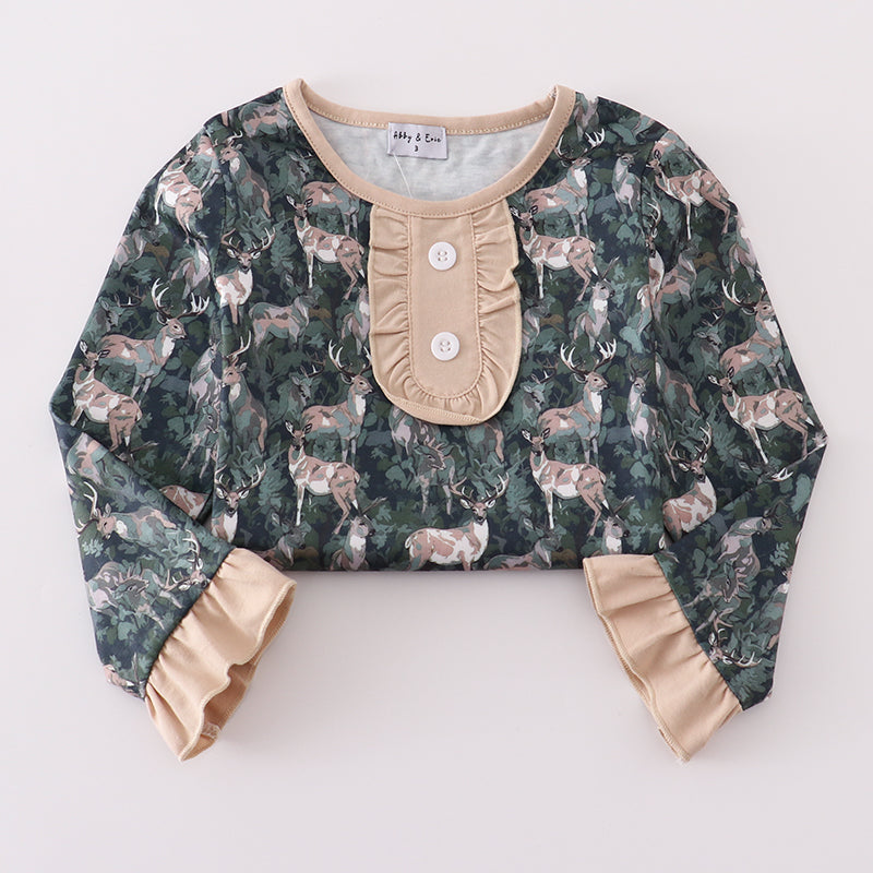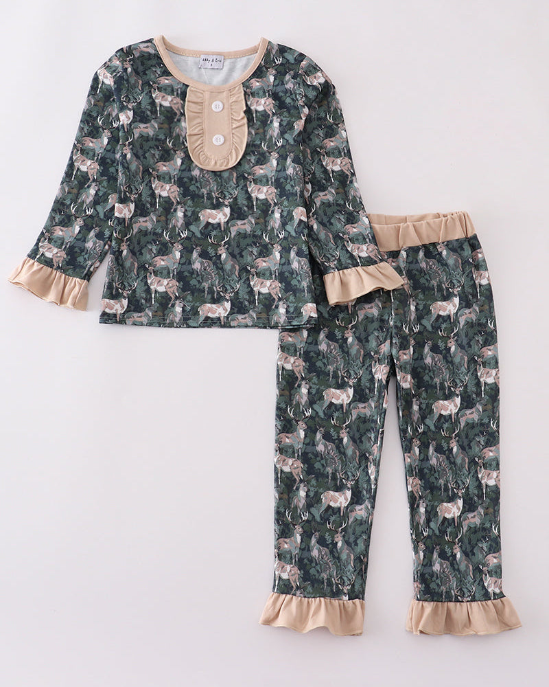 Bring the outdoors inside with the Little Buck Camo Print Ruffle Lounge Set. This adorable two-piece outfit blends rugged camo style with a feminine touch, featuring an allover deer print accented by sweet ruffle trim on the cuffs and pants. The button detail on the chest adds a classic touch, making this set as stylish as it is comfy.