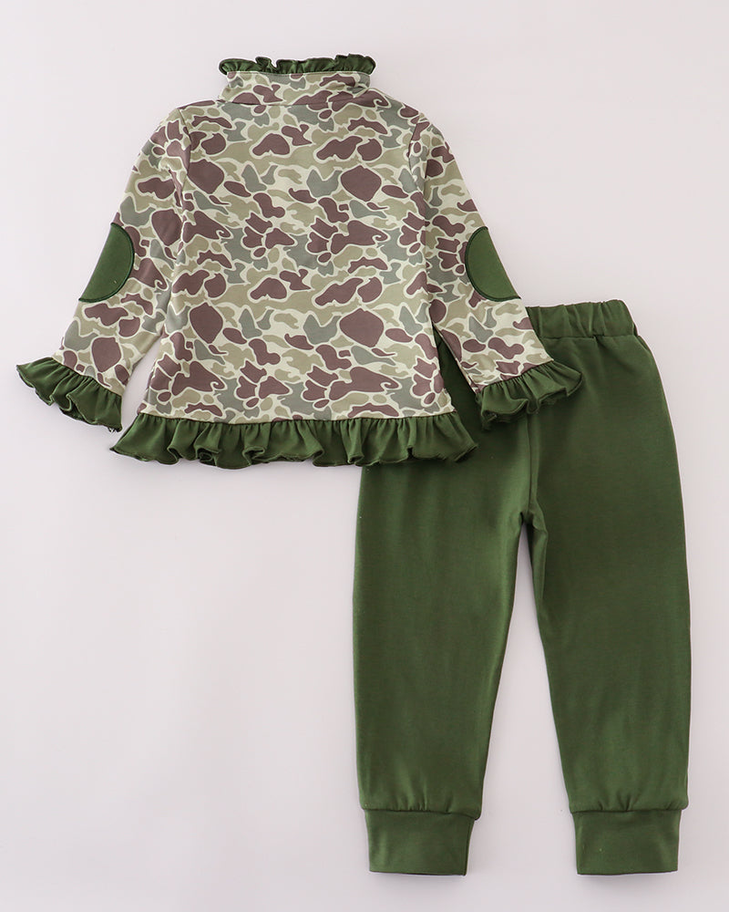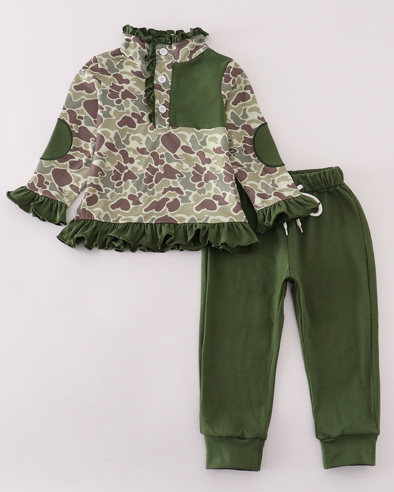 The long-sleeve top features an allover camo print trimmed with deep moss-green ruffles along the neckline, sleeves, and hem. A button-front placket and solid moss-green chest panel add a touch of boutique flair, while elbow patches lend a playful, outdoorsy feel.