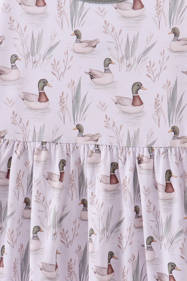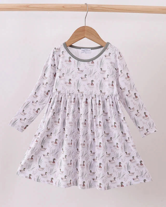 Inspired by the beauty of nature, the Stillwater Mallard Bamboo Dress brings woodland charm to your little one’s wardrobe. Made from buttery-soft bamboo fabric, this long-sleeve twirl dress is breathable, eco-friendly, and gentle on sensitive skin. The all-over mallard duck and reeds print on a soft neutral background makes it perfect for both everyday play and special moments. With its flowy skirt, it’s designed for twirls, comfort, and timeless style.