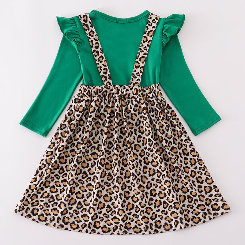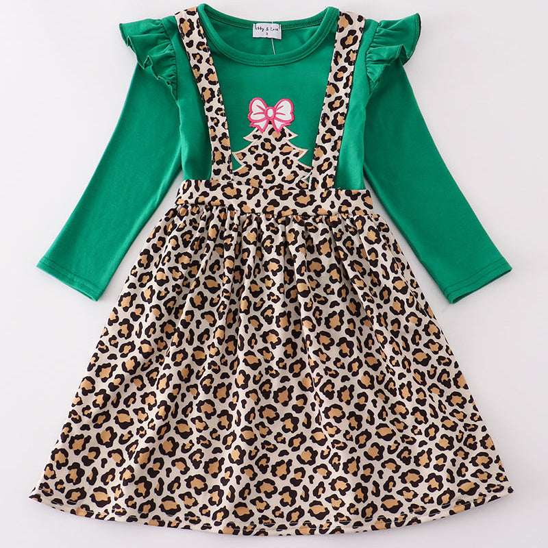 Add a touch of festive fun and wild style to your little one’s wardrobe with the Leopard Holiday Tree Ruffle Dress Set. This adorable 2-piece outfit features a vibrant green long-sleeve top with a Christmas tree applique and bow detail, paired with a trendy leopard print suspender-style jumper dress.
