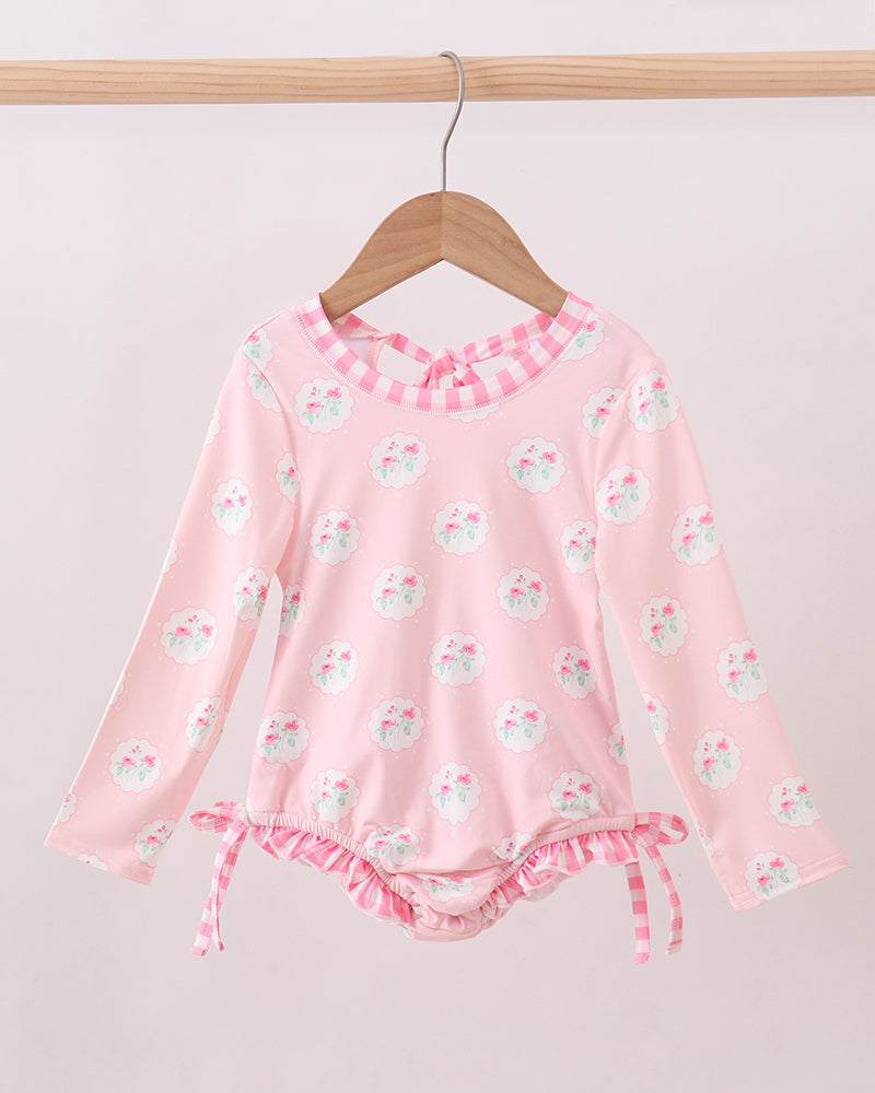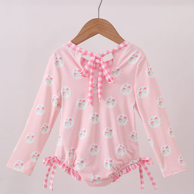Ideal for pool days, beach vacations, and summer adventures, the lightweight, stretchy fabric ensures all-day comfort while keeping her protected from the sun. The delicate rose pattern and gingham accents make this a standout piece for boutique swim collections.