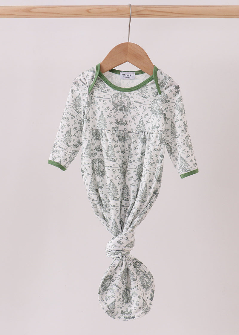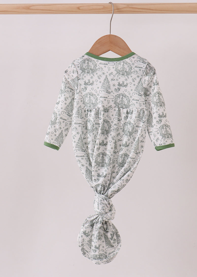 Welcome your little one’s first Christmas in timeless comfort with our Christmas Pines Baby Gown. Made from ultra-soft cotton fabric, this knotted gown features a serene green toile-style Christmas print — filled with festive pines, wreaths, and reindeer for a classic holiday look.