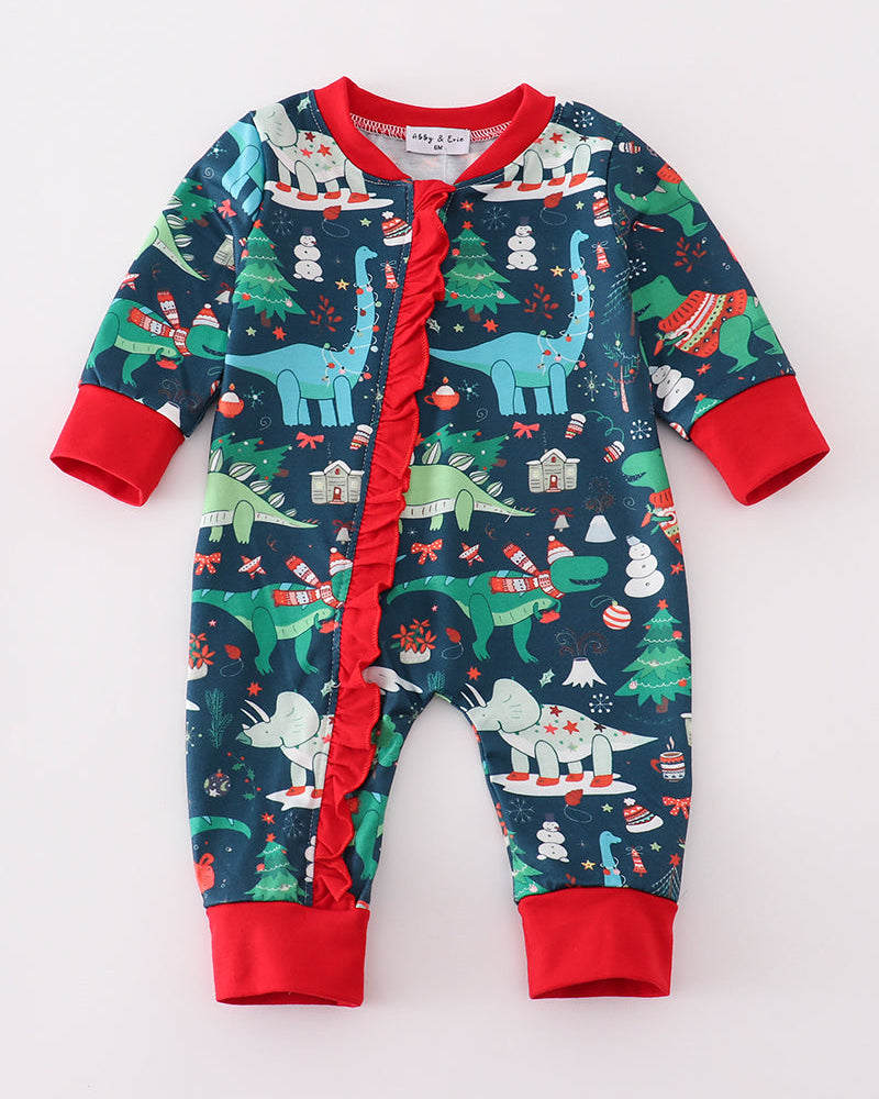 Add a roar of fun to your little one’s holiday wardrobe with the Roaring Holiday Dino Ruffle Baby Romper! This festive romper features playful dinosaurs dressed in Christmas scarves surrounded by trees, snowmen, ornaments, and holiday cheer. The bright red cuffs and neckline add a bold pop of color, while the ruffle trim along the zipper gives it a sweet boutique-style touch.