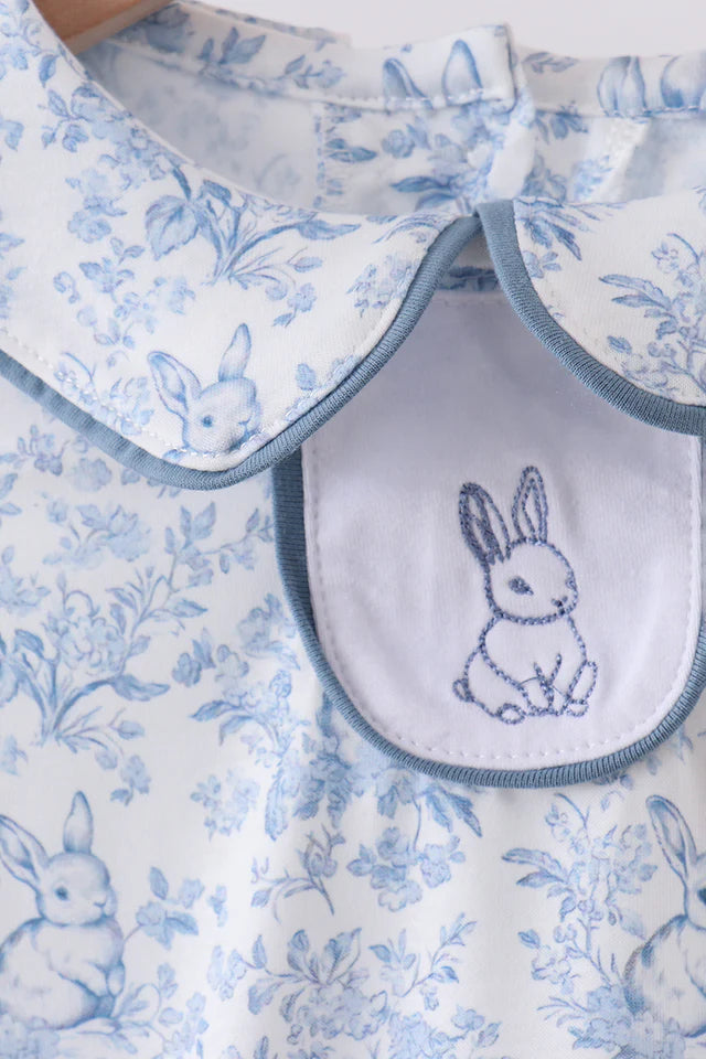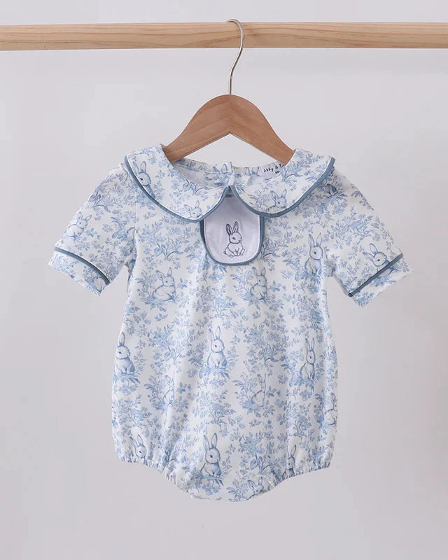 The Honey Bunny Garden Peter Pan Collar Boy Bubble is a timeless spring outfit that combines classic style with sweet bunny details. 🐰💙