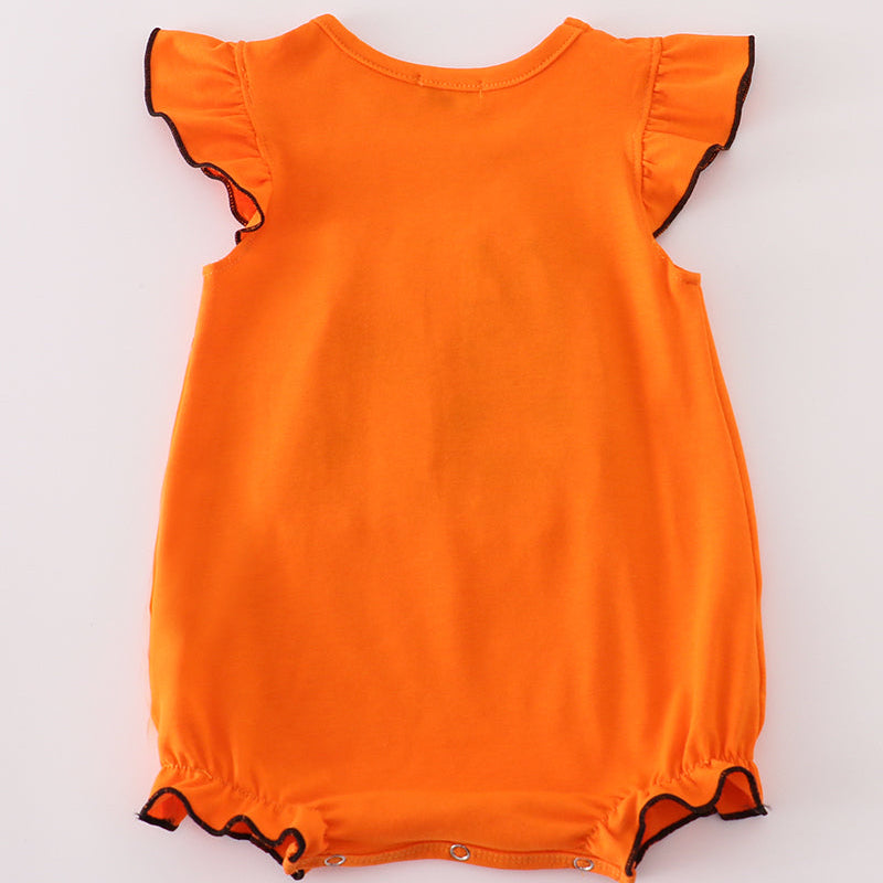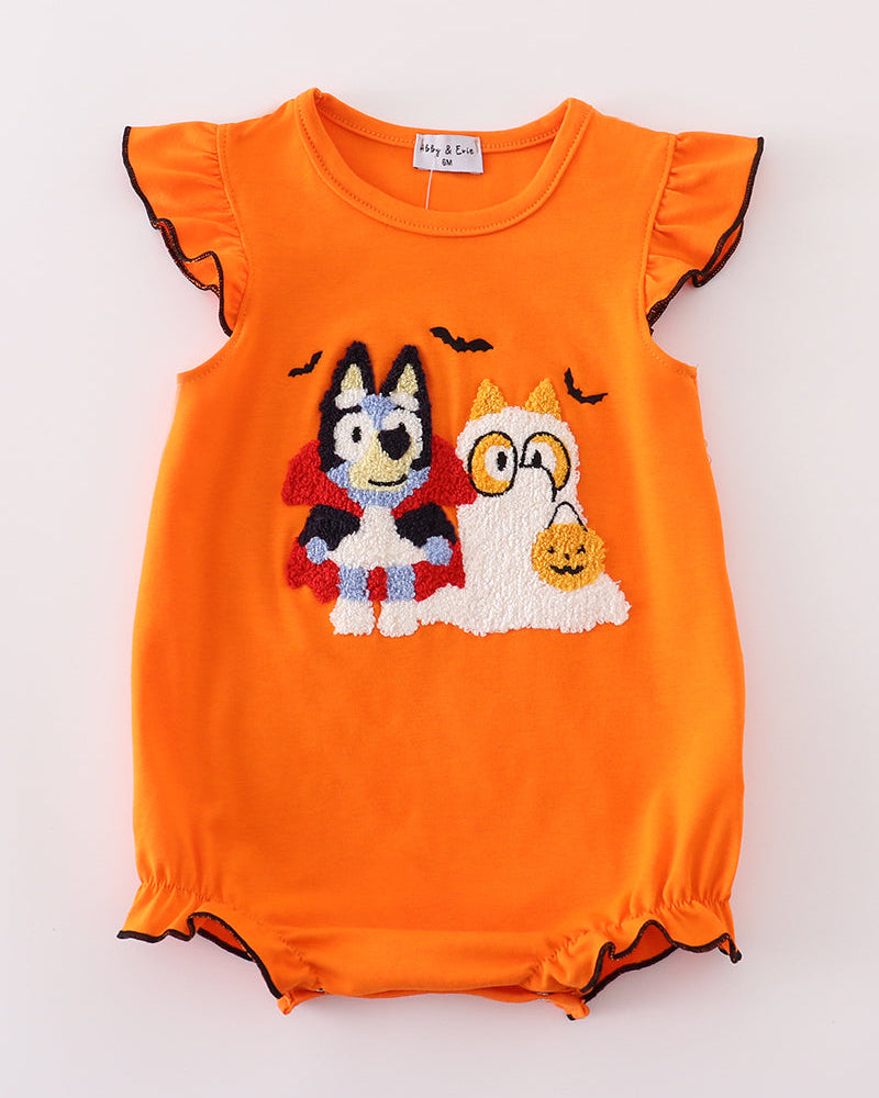 Dress your little one in spooky-sweet style with our Bluey & Friends Halloween French Knot Ruffle Girl Bubble! Featuring an adorable embroidered design of Bluey and friends dressed in their Halloween costumes, this bright orange bubble romper is perfect for festive fall fun. The detailed French knot applique adds a charming handmade touch that makes this outfit stand out. Designed with flutter ruffle sleeves and stretchy leg openings trimmed with contrast piping, this bubble is as comfortable as it is cute. Snap closures at the bottom ensure easy diaper changes, making it a practical yet stylish choice for Halloween parties, pumpkin patch adventures, and adorable photo ops.