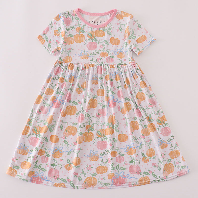 Featuring an all-over pumpkin print on a warm blush background, this dress captures the magic of autumn—from pumpkin patch adventures to family photos. Its lightweight, stretchy material allows for easy movement, while the classic silhouette makes it versatile for layering with cardigans, leggings, or boots.