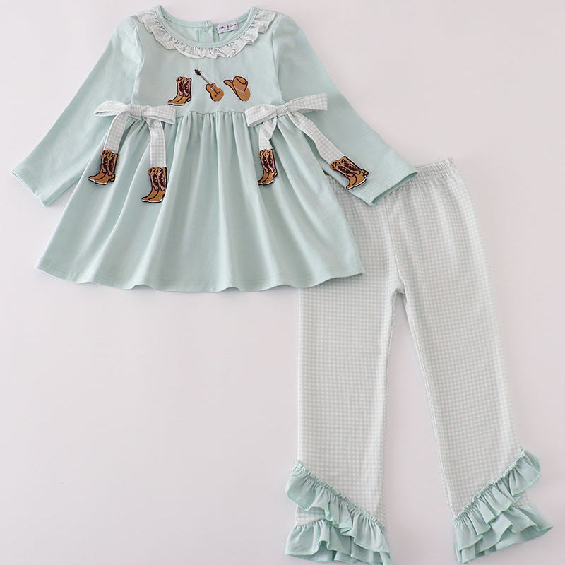 Bring on the western charm with our Boot Scootin’ Embroidered Blue Ruffle Pants Set! This darling two-piece boutique outfit is designed with soft blue tones, fun boot and hat embroidery, and sweet details that make it a must-have for your little one’s wardrobe.