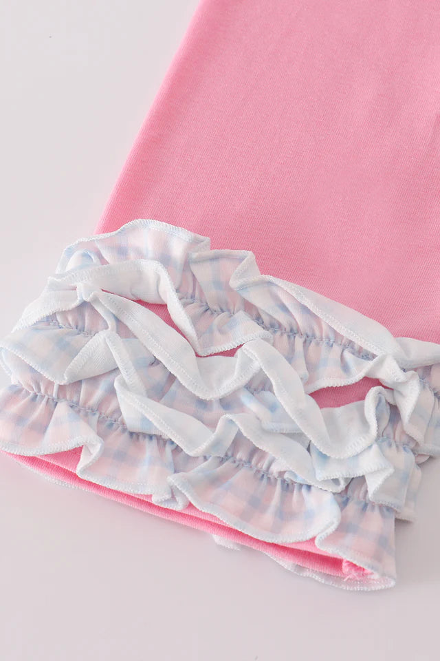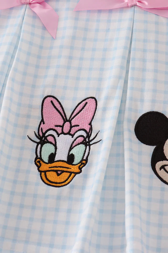Bring a touch of Disney magic to your little one’s wardrobe with the Donald & Friends Embroidered Pink Ruffle Pants Set. This charming two-piece outfit features a pastel gingham tunic with delicate pink bows, a Peter Pan collar, and beautifully embroidered characters—Minnie, Daisy, Mickey, and Donald—across the hem. Paired with soft pink pants adorned with tiered ruffle cuffs, this set blends comfort and cuteness for everyday play, park visits, or special outings. Made from soft, breathable fabrics for all-day wear.
