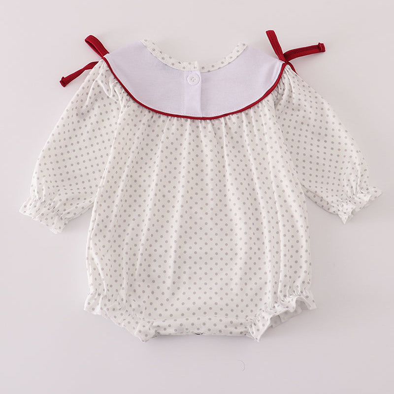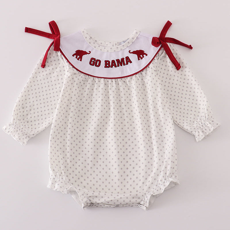 Cheer on the Crimson Tide in the cutest way with this Go Bama Elephant Embroidered Alabama Girl Bubble! Featuring a polka dot print body, this adorable bubble romper is accented with a white yoke embroidered with crimson elephants and bold “Go Bama” lettering. Sweet bow tie details on the shoulders and soft elastic leg openings ensure a comfortable and picture-perfect fit for game days, tailgates, and spirited family gatherings.