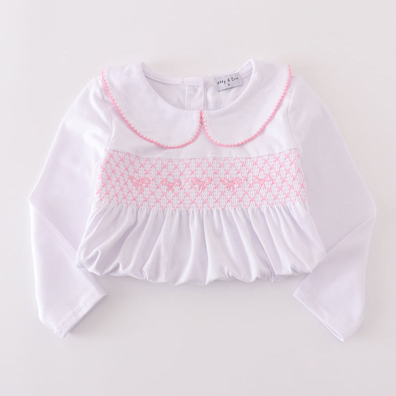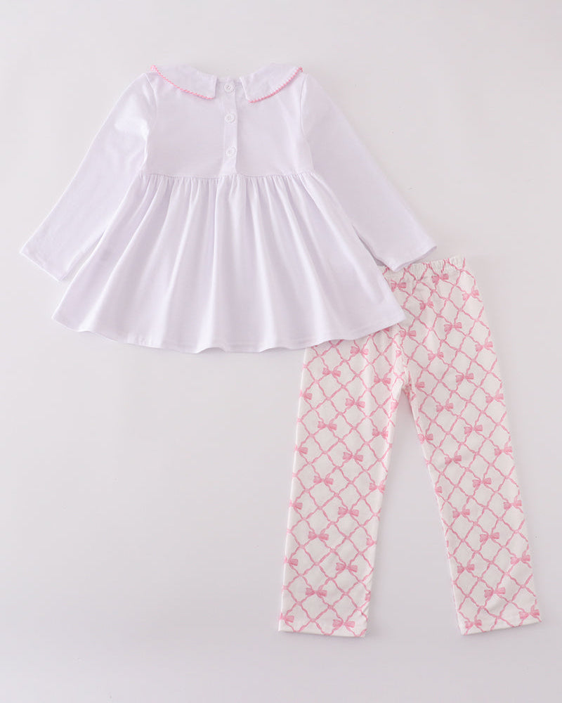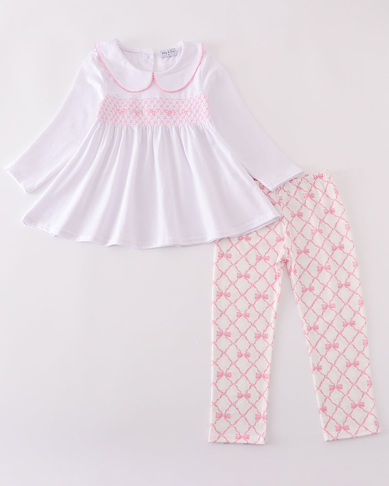 Dress your little one in timeless charm with our Pink Bow Smocked Girl Pants Set. This sweet ensemble features a white long-sleeve smocked tunic adorned with delicate pink stitching and a Peter Pan collar, paired with matching bow print pants for a coordinated look. Made from soft, breathable fabric, this outfit ensures all-day comfort while keeping your little girl stylish. Perfect for family gatherings, playdates, or photo sessions, this set is as comfortable as it is adorable.
