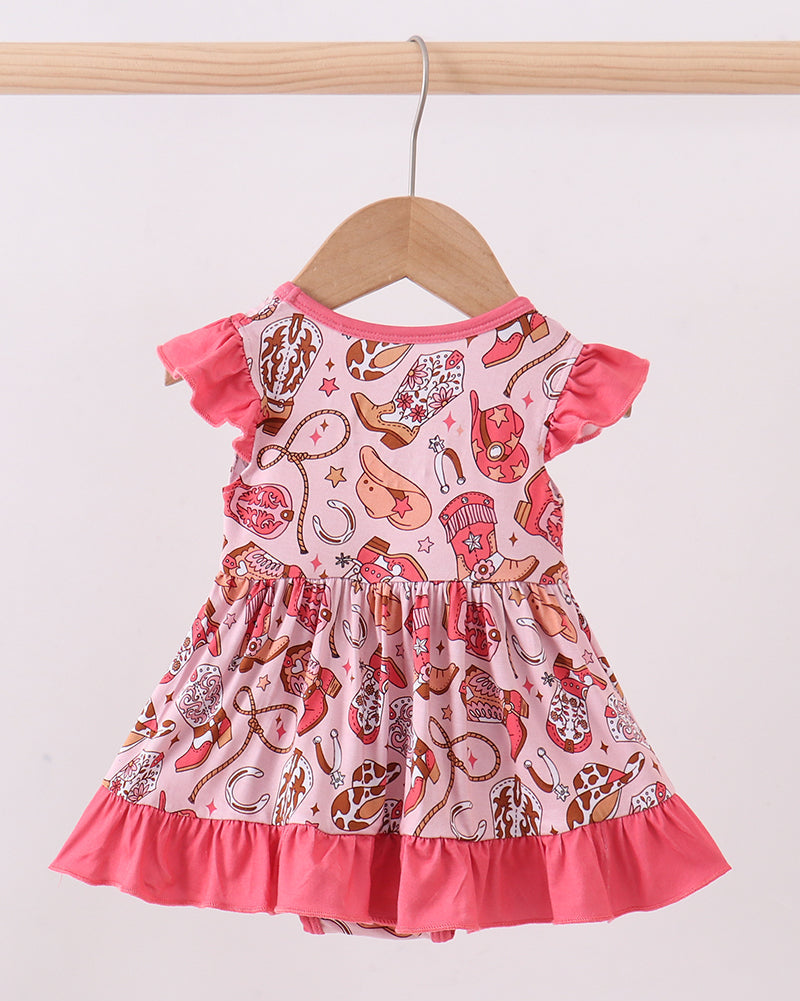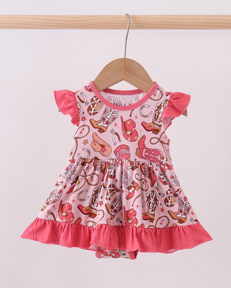 Flutter sleeves and a sweet ruffle hem add extra flair, while the lightweight, breathable design keeps baby comfy all day long. With a relaxed fit and easy snap closures for quick changes, this bubble is perfect for everyday wear, playdates, rodeo days, or western-themed outings.