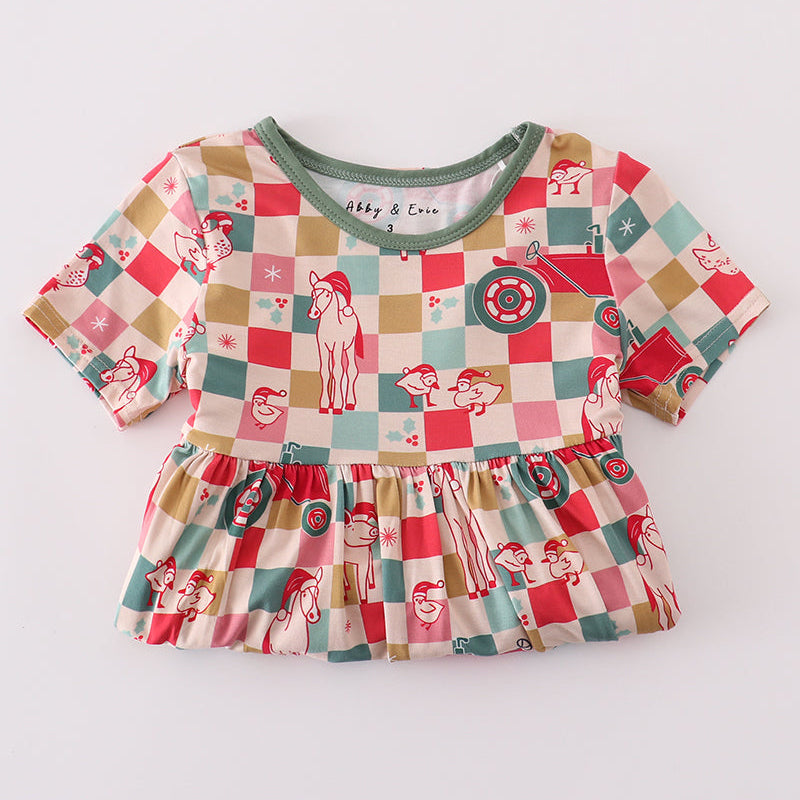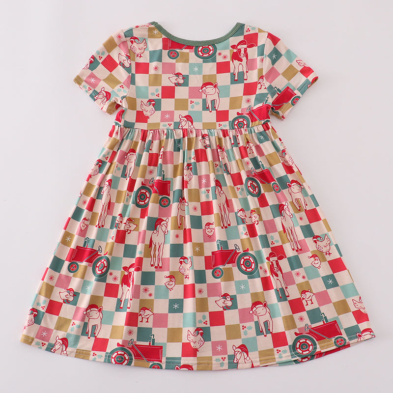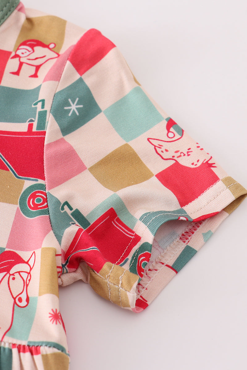 Bring a touch of farmhouse cheer to her holiday wardrobe with the Farmyard Christmas Checkered Bamboo Dress. Designed in a playful plaid print featuring festive farmyard animals, tractors, and holiday motifs, this dress is perfect for creating magical memories this season.