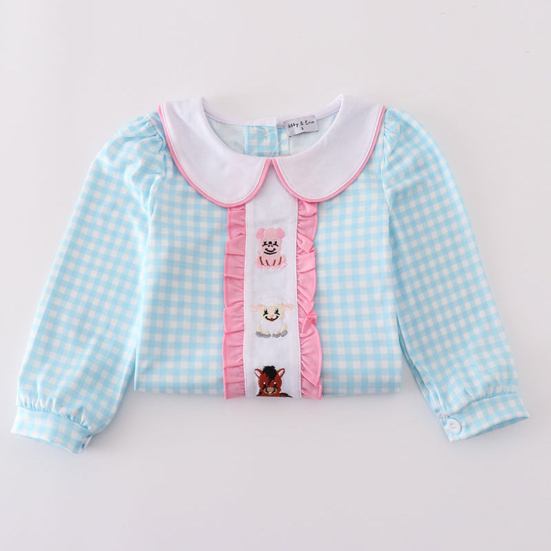 Bring playful farmyard charm to your little one’s wardrobe with our Pasture Pals Embroidered Blue Gingham Ruffle Pants Set 🐮🐴🐷. This two-piece outfit is both darling and comfortable, designed for all-day wear and timeless cuteness: