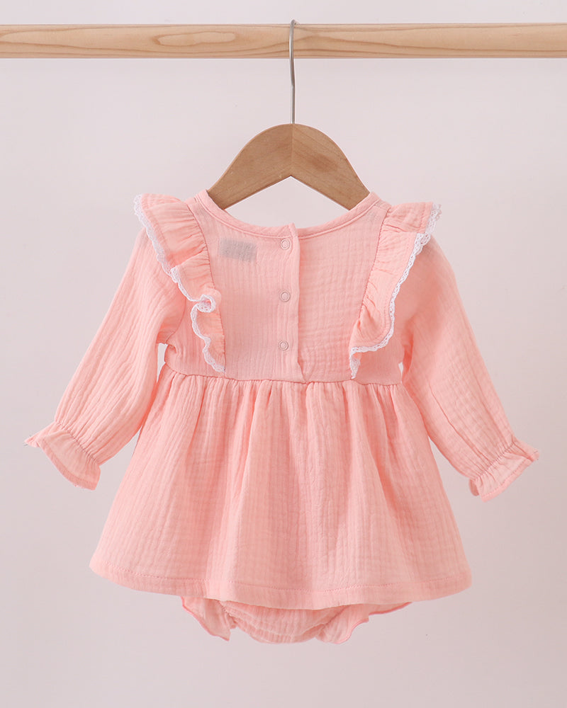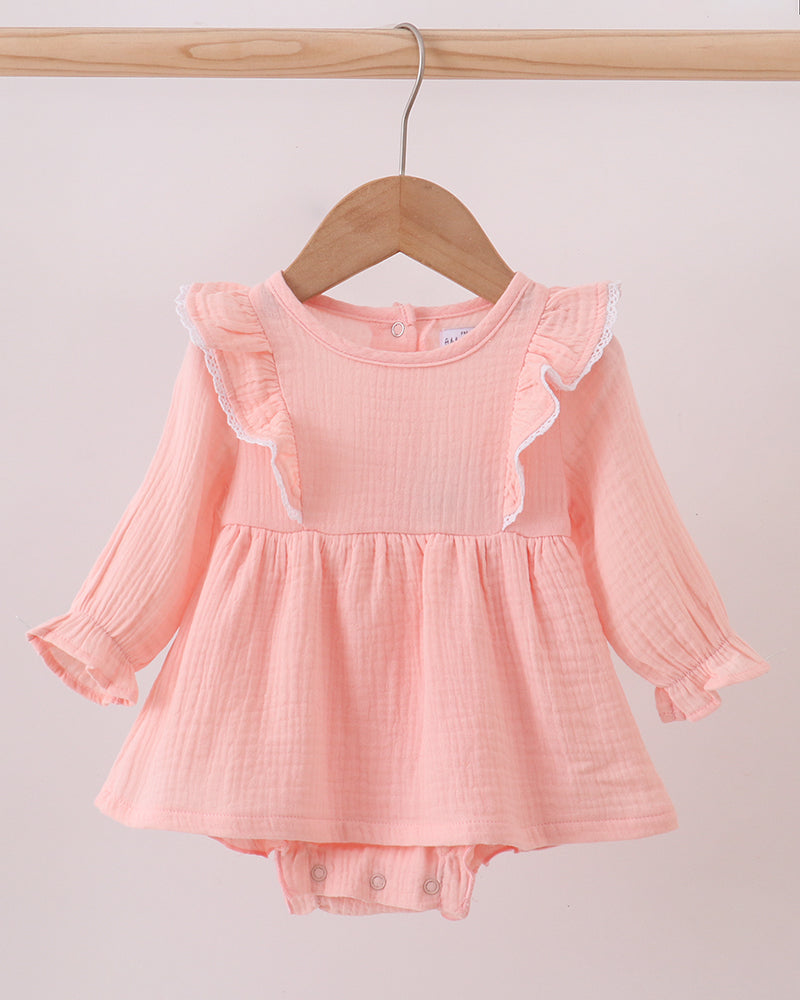 Sweet, soft, and stylish — the Amara Pink Ruffle Muslin Bubble is designed with boutique charm and everyday comfort in mind. Crafted from premium cotton muslin, this bubble romper is breathable, lightweight, and gentle on delicate skin. The blush-pink hue is paired with ruffled details trimmed in lace, giving it a timeless, feminine finish. Long sleeves with elastic cuffs and built-in snaps make it as practical as it is adorable.
