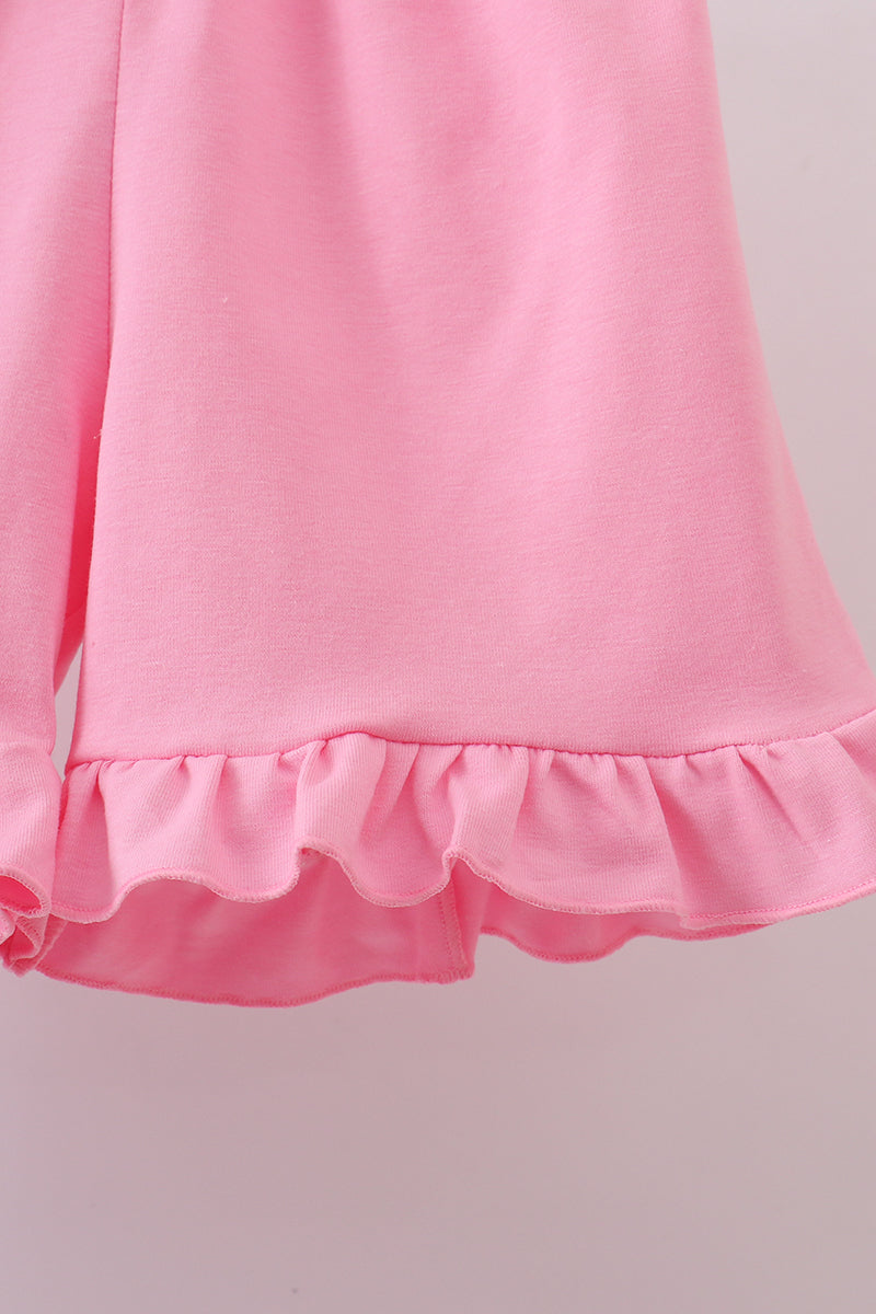 Playful print meets charming detail in the Butterfly Belle Leopard Smocked Ruffle Shorts Set. This darling two-piece outfit features a soft purple leopard print top with a smocked neckline adorned with embroidered butterflies, paired perfectly with coordinating pink shorts finished with a sweet ruffle hem.