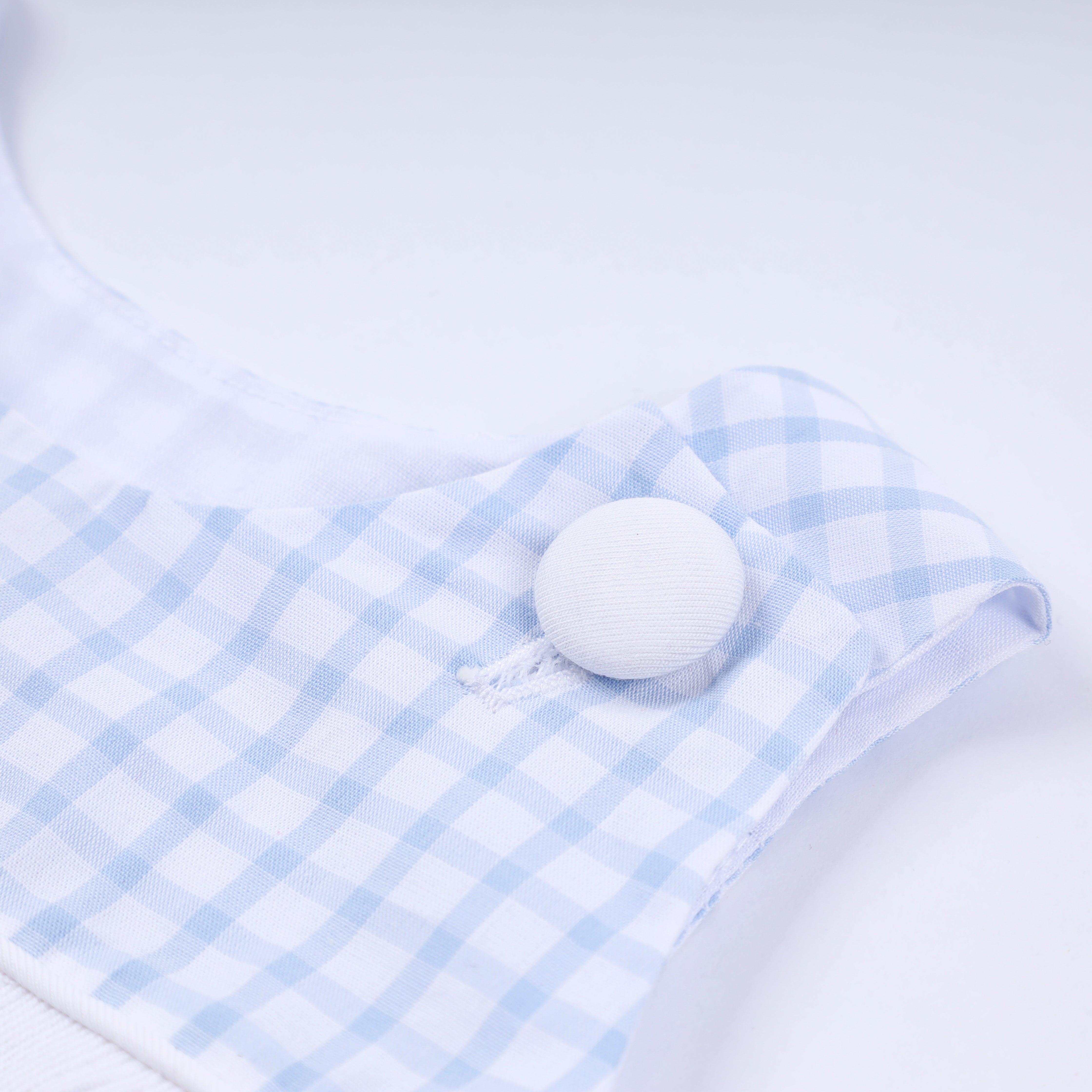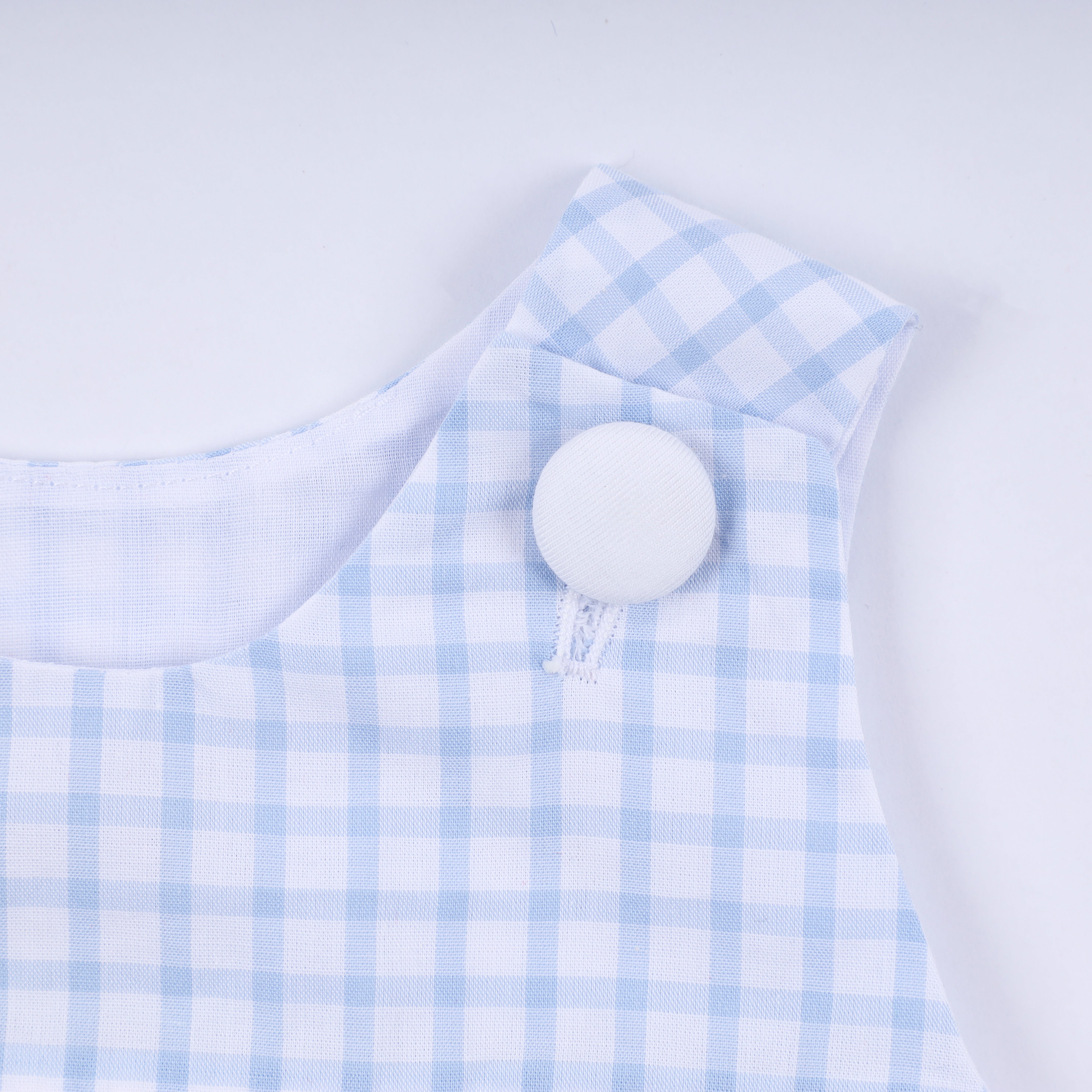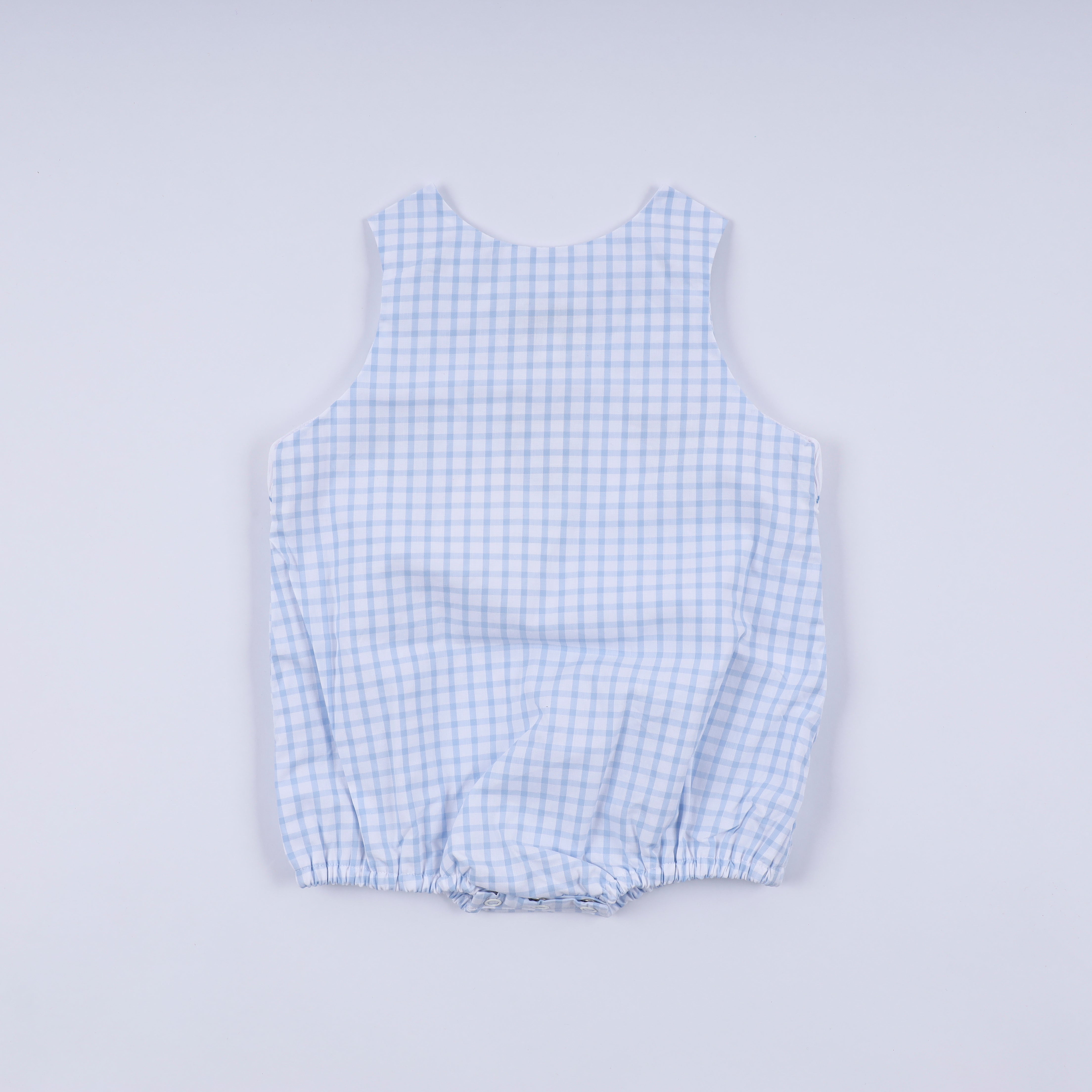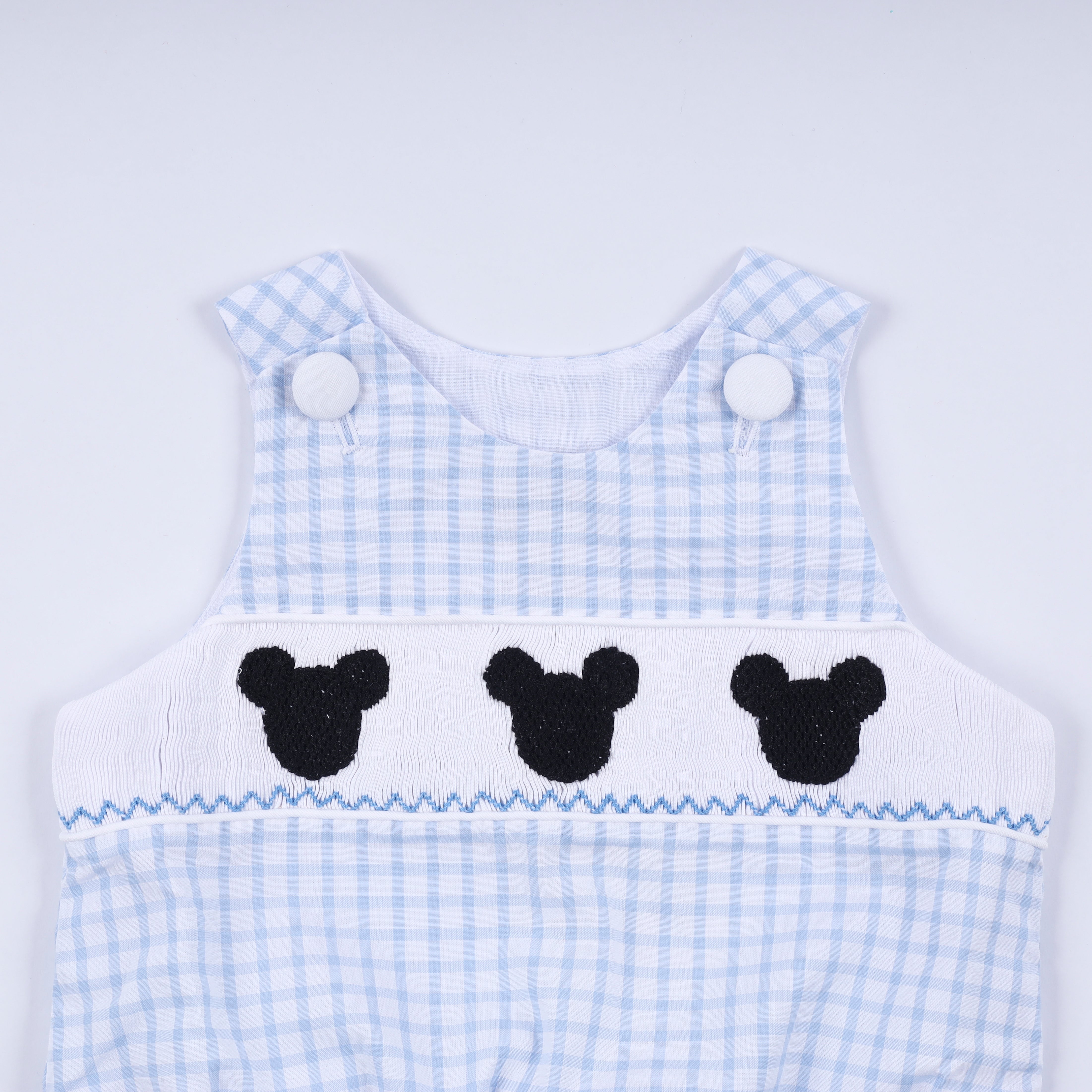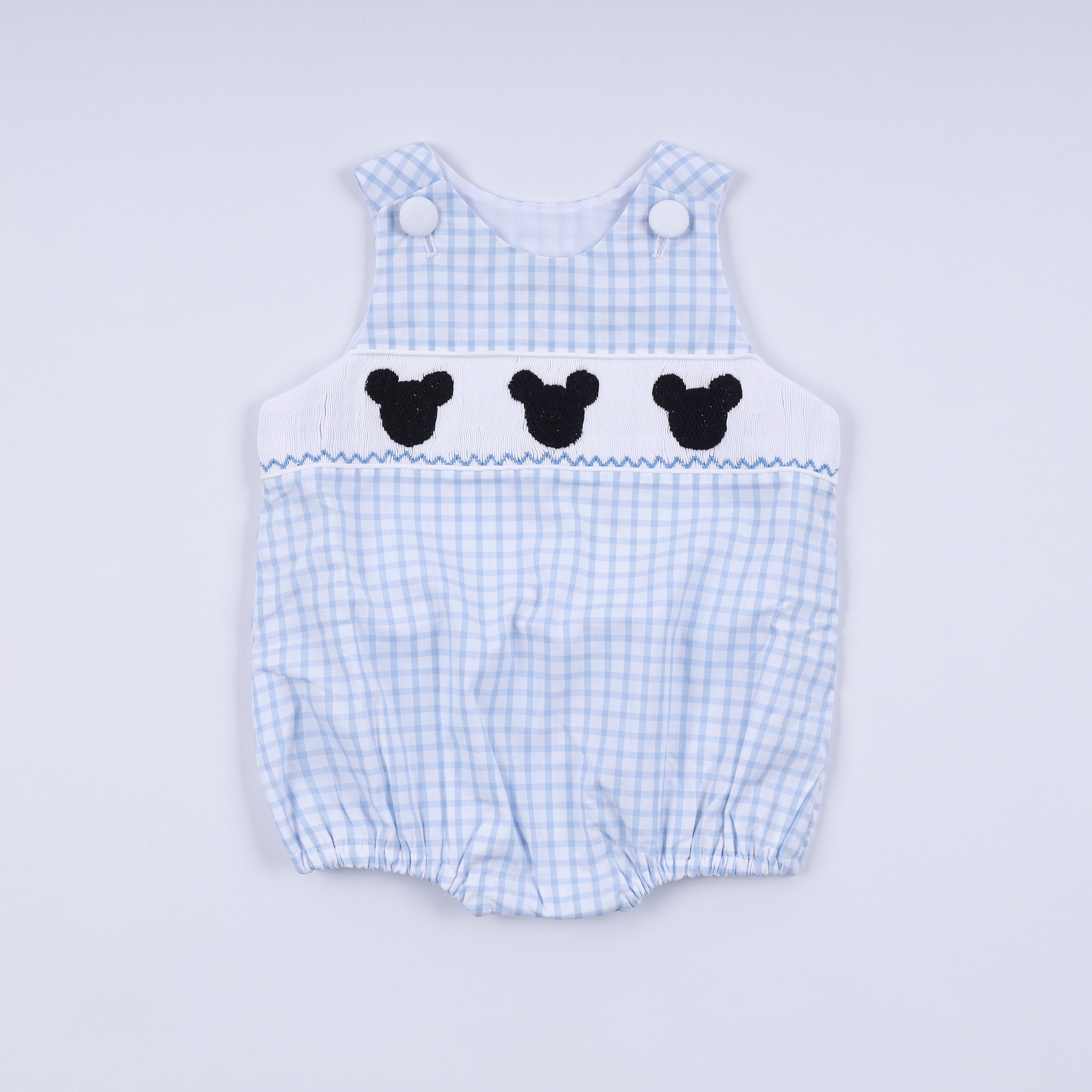 Dress your little one in timeless charm with our Classic Mouse Smocked Blue Gingham Boy Bubble. This sweet bubble features soft blue gingham fabric and a beautifully hand-smocked panel showcasing three classic mouse silhouettes. The lightweight design keeps baby comfortable, while the buttoned shoulders and elastic leg openings allow for easy dressing and a perfect fit.